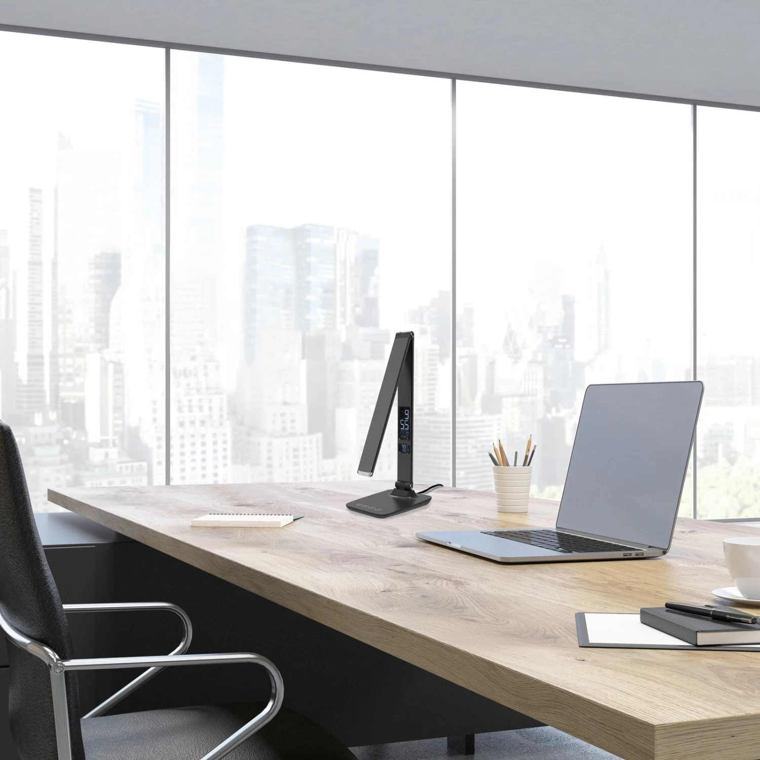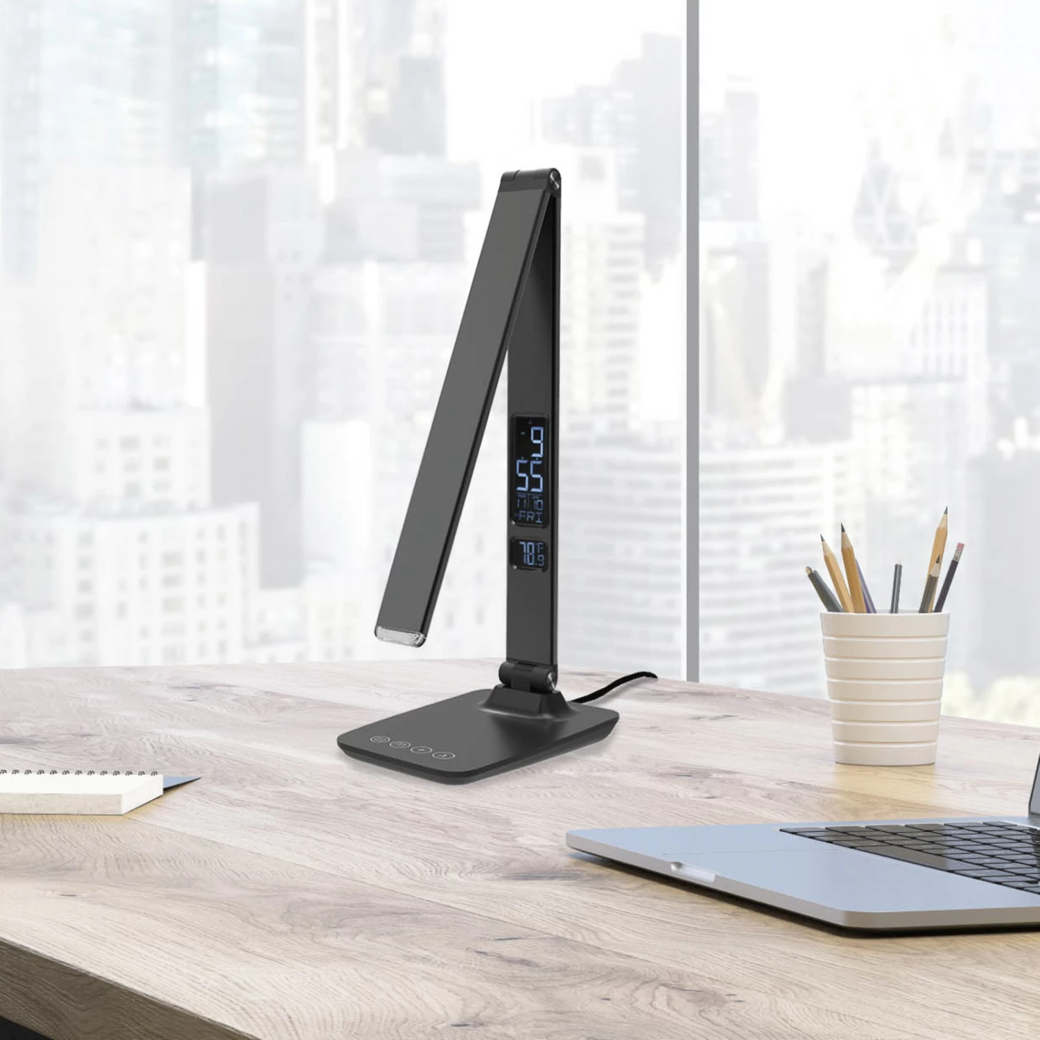 Lampe de bureau LED Sandra avec indication intégrée de l’heure, de la date et de la température La lampe de bureau LED Sandra peut être utilisée de manière très polyvalente. Son design innovant est associé à une fonctionnalité moderne. La tête de lampe étroite et allongée peut être ajustée vers le haut et vers le bas, de sorte que l’orientation de la lumière peut être parfaitement adaptée aux besoins individuels. Le corps est doté d’un petit écran sur lequel on peut lire l’heure, la date et la température. Des LED puissantes sont intégrées, dont la couleur de lumière peut être réglée en continu, du blanc chaud pour une lumière d’ambiance douce au blanc lumière du jour pour une lumière de travail optimale. L’intensité lumineuse peut également être réglée en continu. Avec fonction d’extinction automatique de l’éclairage activé après une durée prédéfinie. Connexion USB et câble avec adaptateur secteur inclus. – réglable en hauteur (10-39,8 cm)