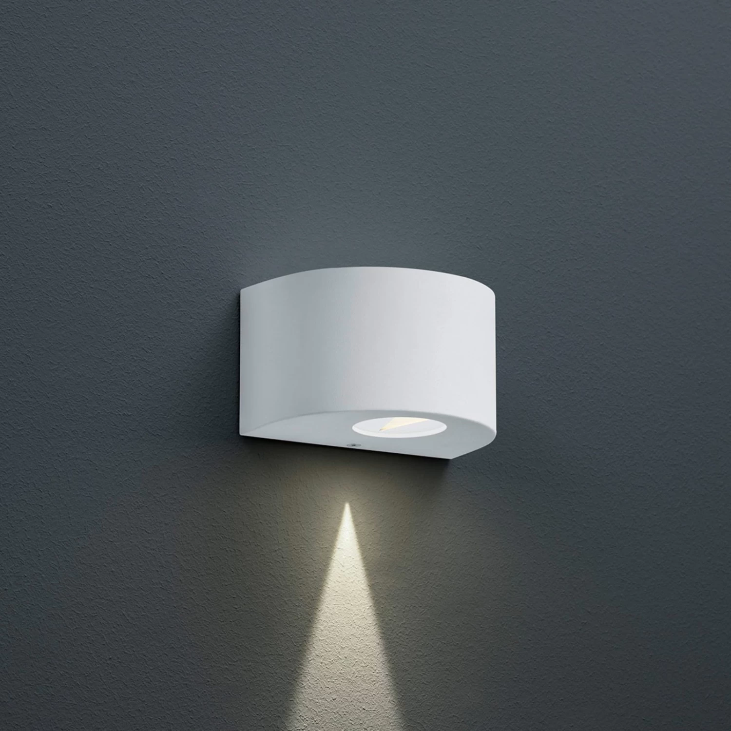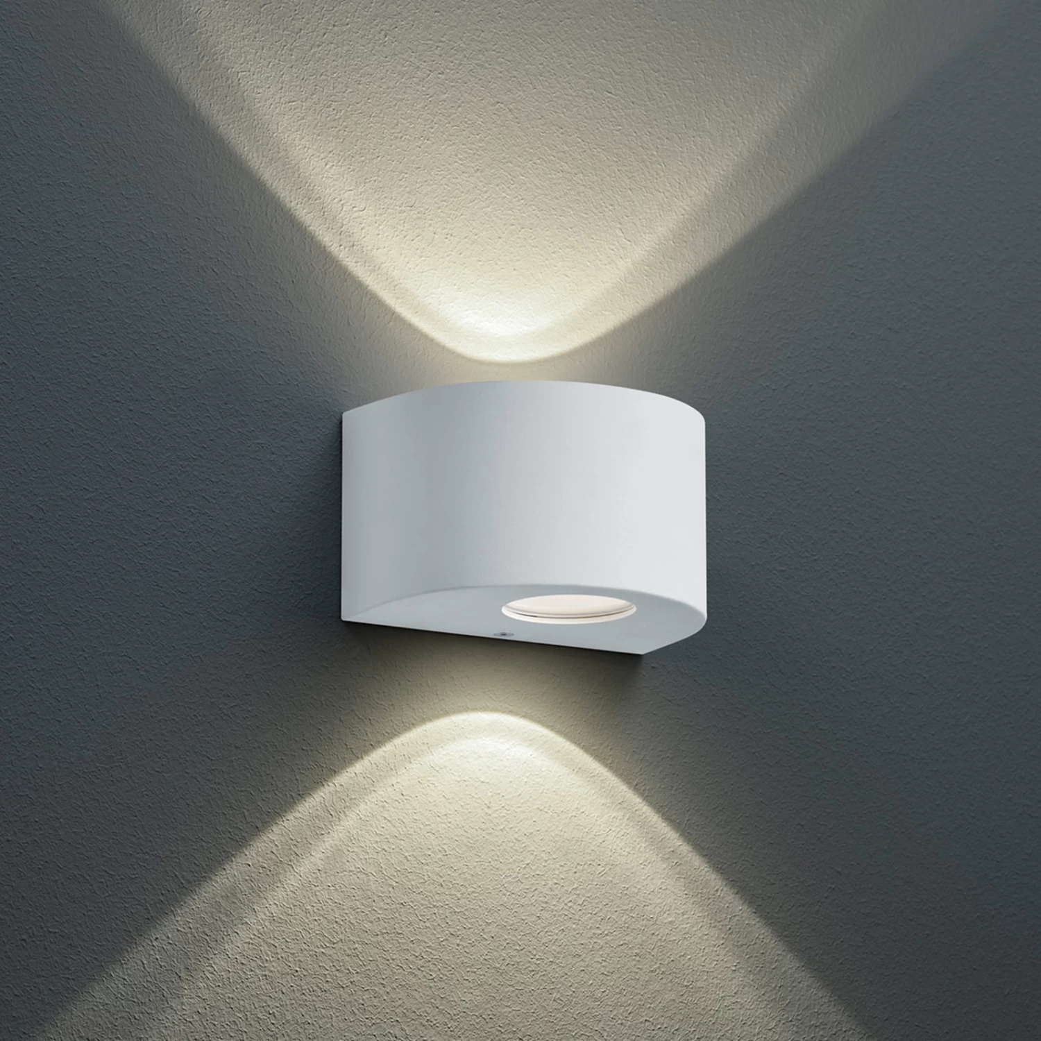 Le luminaire mural extérieur Rosario LED se présente sous une forme semi-circulaire. Le boîtier en plastique mat est pourvu d’une ouverture ronde en haut et en bas, de sorte que la lumière des deux sources de lumière LED émerge des deux côtés. Pour ce faire, des couvertures assorties sont incluses dans le volume de livraison. Avec des ouvertures de conception différente, elles offrent des motifs lumineux intéressants sur le mur de la maison.