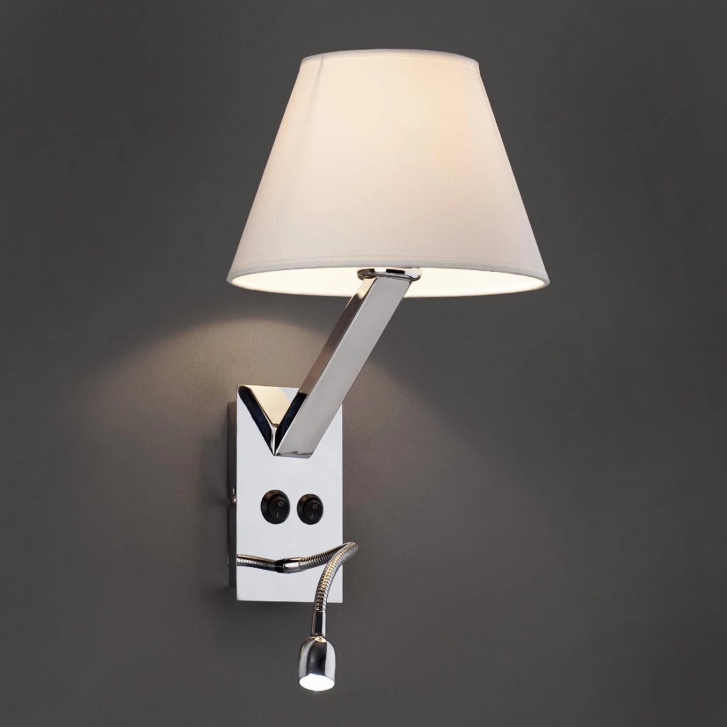L’applique murale LED Moma-2 élégante séduit par son design moderne et évocateur. Le support en métal argenté brillant est doté d’un bras LED flexible et inclinable (6 000K, 80 lm) et mène à un abat-jour en textile, qui diffuse une lumière agréable. Cette applique est également idéale comme éclairage de table de chevet et est pourvue à cet effet de deux interrupteurs pour une utilisation séparée des deux sources de lumière. Livré avec un transformateur LED.