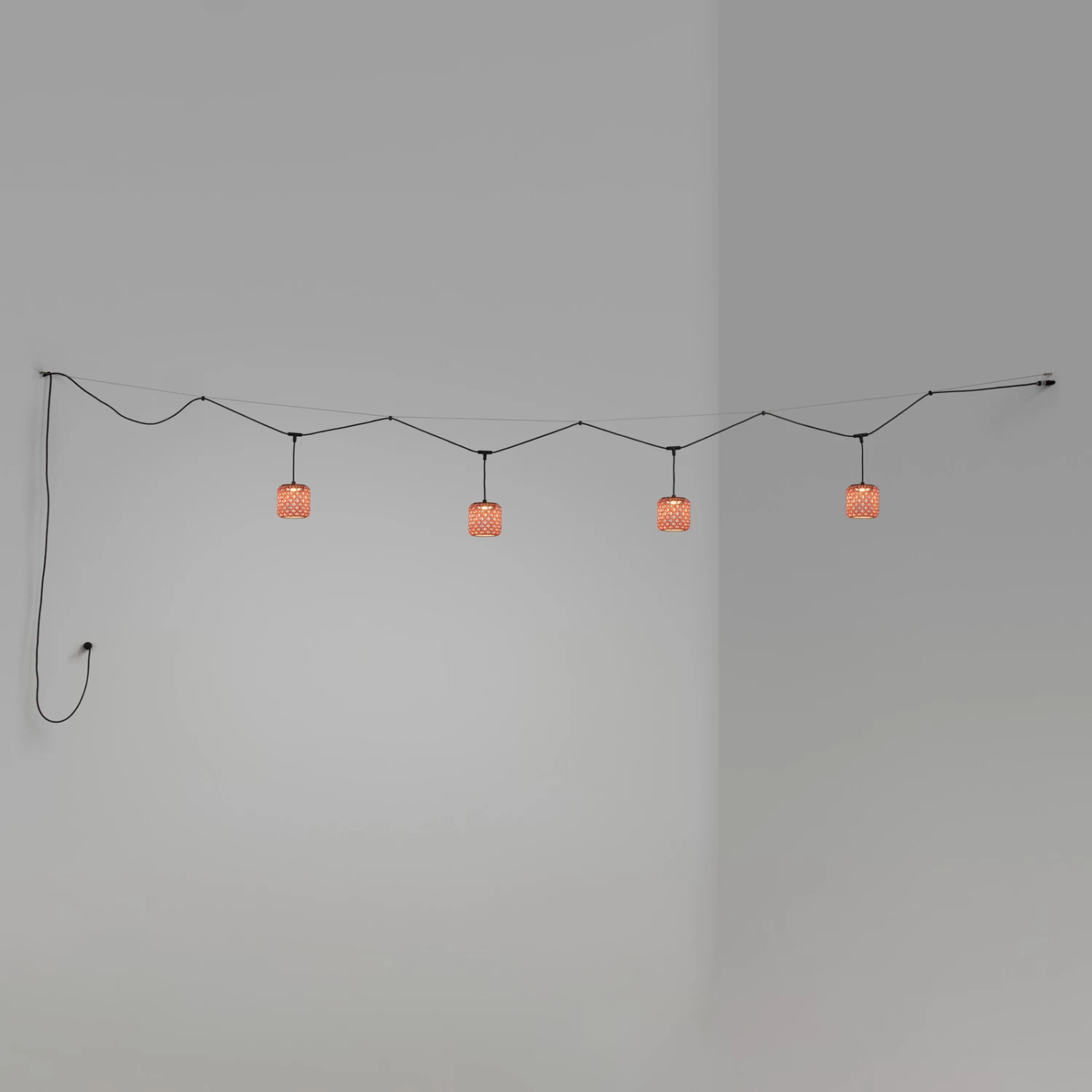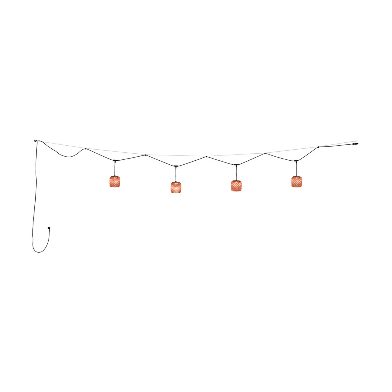 Quatre suspensions sur un câble d’alimentation : « Guirlande lumineuse » Nans pour l’extérieurLe modèle Nans S/16/4L est une suspension très particulière, car il s’agit en fait d’un mélange entre une guirlande lumineuse et une suspension, Nans n’ayant pas une seule suspension, mais quatre. Cette guirlande lumineuse suspendue permet d’éclairer l’extérieur de manière particulièrement raffinée et stylée, que ce soit sur la terrasse, le balcon, à l’abri ou non. Il est seulement important de disposer d’une prise de courant à proximité pour alimenter les luminaires en électricité. Nans est un modèle de la maison Bover de Barcelone. La fondatrice Joana Bover a elle-même conçu cette série de luminaires pour l’extérieur et apporte ainsi l’ambiance de sa ville natale, Barcelone, et de la Méditerranée dans la maison de nombreuses autres personnes.