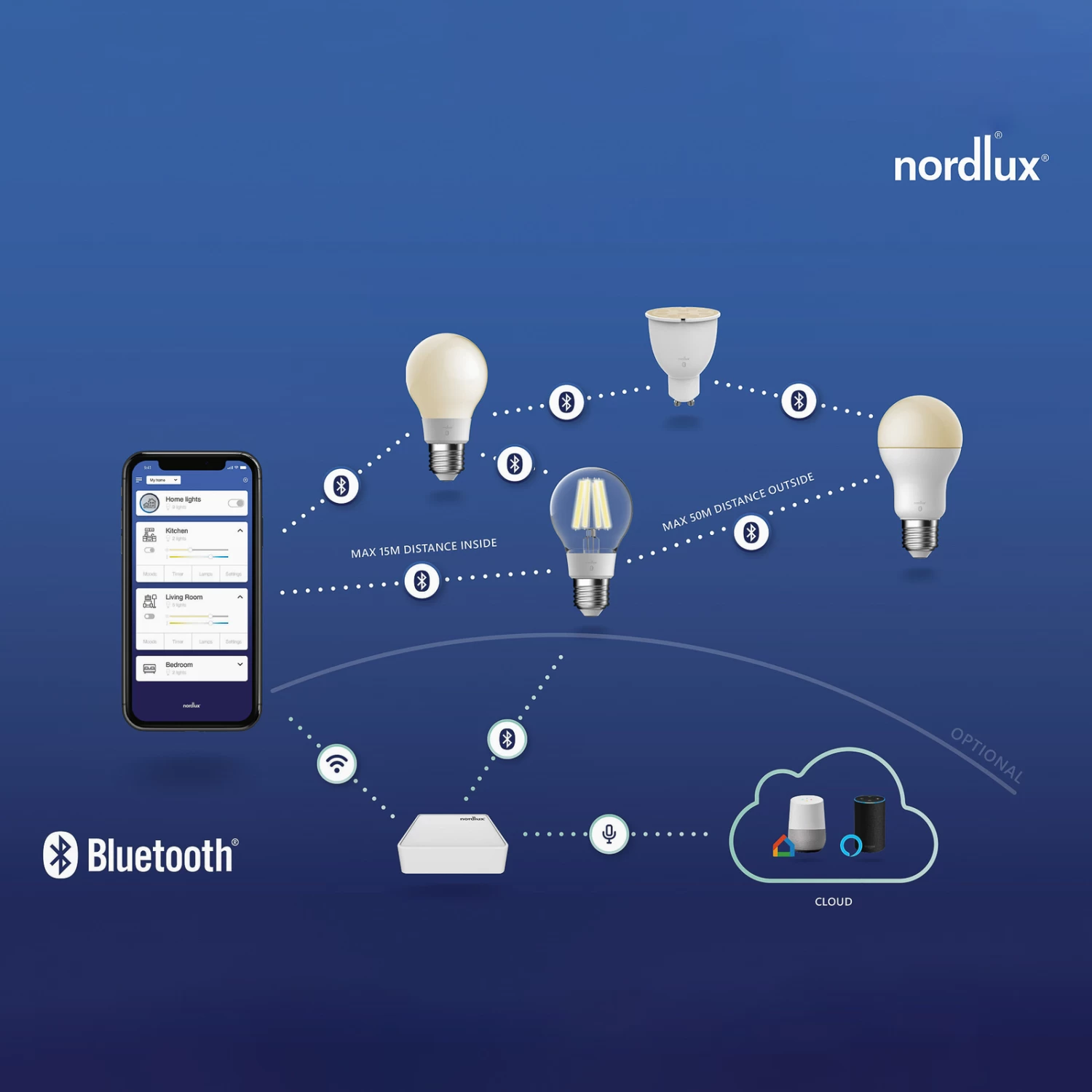 Pont Wifi pour les produits Nordlux Smart Light (version UE) avec deux ampoules à filament E27Le pont Smart Bridge étend les fonctions et les réglages des produits Nordlux Smart. Les luminaires et les ampoules sont commandés par la technologie Bluetooth mesh. Grâce au bridge, il est possible de configurer des horaires et des programmes, de commander l’éclairage de ses quatre murs depuis n’importe où et d’activer une simulation de présence, par exemple lorsqu’on est en vacances ou au travail. De plus, grâce au pont, les luminaires peuvent également être commandés par la voix. Les articles Smart de Nordlux sont compatibles avec les assistants vocaux Amazon Alexa et Google Home.- connecte Bluetooth Mesh avec WLAN- commande vocale avec Amazon Alexa ou Google Home- paramètres partageables avec d’autres utilisateurs- livré avec deux ampoules E27 en optique filament