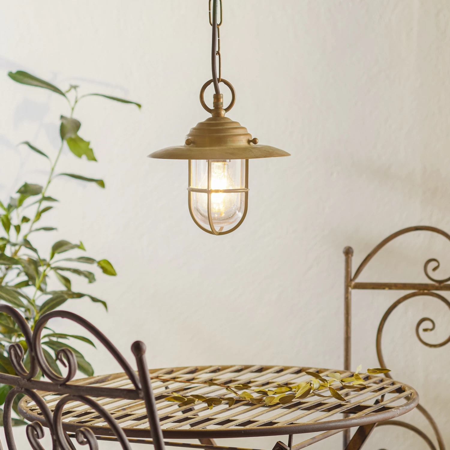 Lampe à suspendre Bruno en laiton d’aspect antiqueLa lampe à suspendre Bruno est conçue pour une utilisation en extérieur grâce à son indice de protection IP44, où elle assure un bon éclairage général sous les avancées de toit. Elle dispose d’un abat-jour en laiton largement évasé qui se balance sur une suspension à chaîne massive. Sous l’ampoule de protection se trouve une douille E27 dans laquelle l’ampoule est insérée. La corbeille en laiton confère à l’aspect une note particulièrement rustique, de sorte que le luminaire produit non seulement un magnifique effet lumineux, mais aussi un effet décoratif. Grâce à l’utilisation de laiton résistant à la corrosion, elle résiste en outre à l’eau de mer.