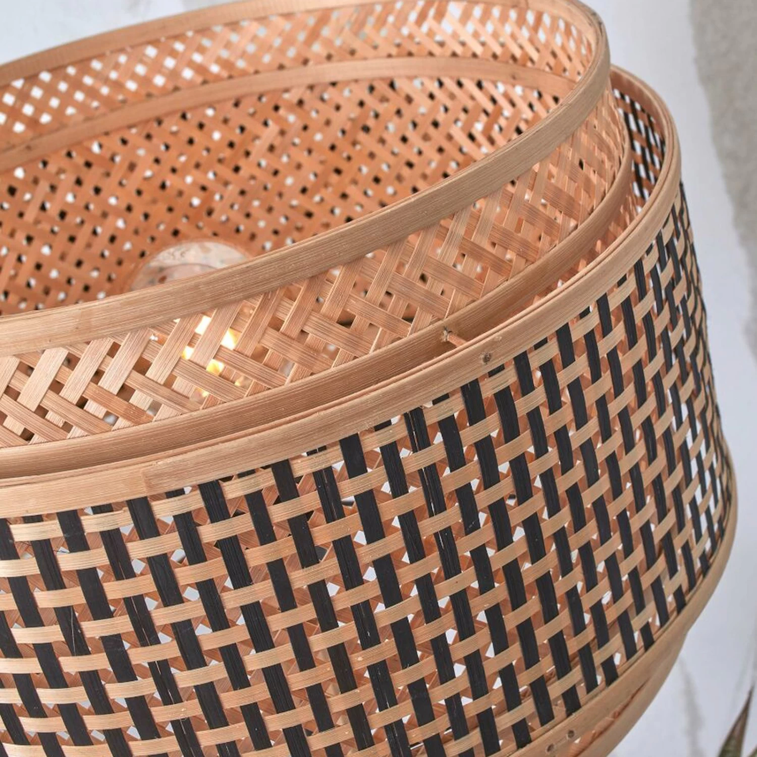 Lampadaire décoratif Bhutan avec surfaces de rangement pratiquesDistributeur de lumière et surface de rangement pratique en un – voilà ce que propose le lampadaire Bhutan. La structure et l’abat-jour sont tous deux fabriqués en bambou, un matériau renouvelable. L’abat-jour se distingue par son aspect particulier à double couche. L’abat-jour intérieur est de couleur naturelle, tandis que l’élément extérieur est noir. Deux petites surfaces de rangement de différentes hauteurs sont fixées sur le piètement étroit et peuvent accueillir des livres, des plantes ou des objets de décoration. Le lampadaire s’allume et s’éteint à l’aide d’un interrupteur à pied.A propos de Good & Mojo:- marque durable et sociale- une grande partie de l’éclairage est fabriquée à la main par des artisans dans de petites communautés au Vietnam- matériaux durables issus de plantes abondantes en Asie du Sud-Est- pour chaque lampe vendue, la WakaWaka Foundation reçoit un don et un arbre est planté par le biais de l’Eden Reforestation Projects