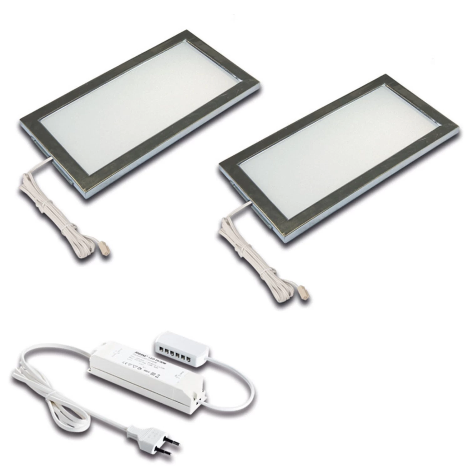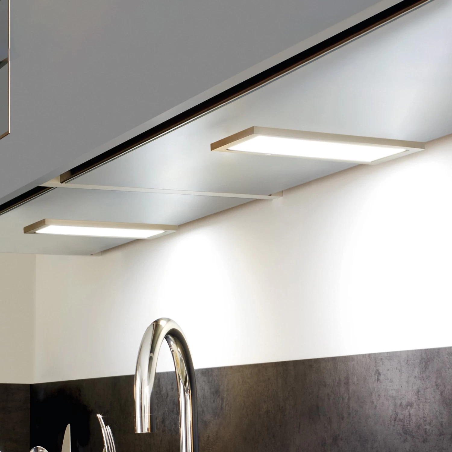 Le luminaire d’intérieur LED Sky est disponible en deux versions, dont un transformateur LED 24/30W pour la mise en service. Les LED intégrées à longue durée de vie ont un développement lumineux de grande surface, ce qui rend les luminaires particulièrement adaptés comme lampes de travail dans la cuisine. Grâce à leur boîtier en plastique plat, ils sont à peine visibles sous un placard ou sur une étagère.
