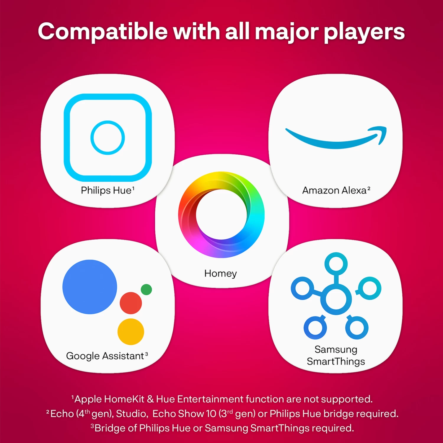 Contrôlable par la voix avec Amazon Alexa, Google Assistant ou Samsung Smart Things en combinaison avec un pont Hue. Connectable directement (sans pont) avec l’Amazon Echo Plus ou l’Echo Show 2ème génération.