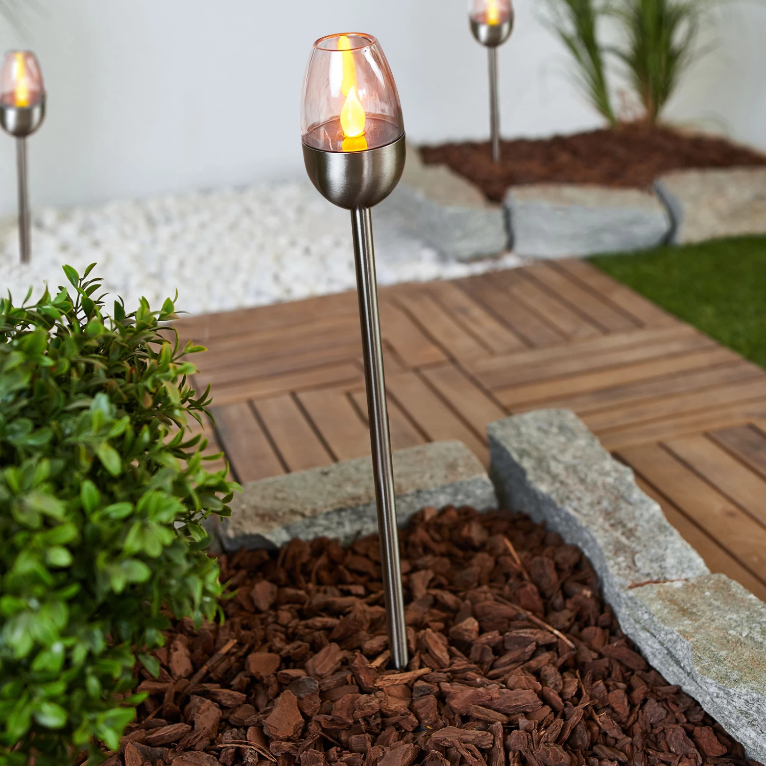 Lugin est un kit de trois lampes de jardin élégantes qui sont équipées d’un fin piquet de sol. L’aspect dégagé est élégant et séduisant ; la plus grande partie des lampes solaires LED consiste en de l’inox et, en haut, là où se trouvent les LED, les lampes présentent un matériau synthétique transparent qui harmonise avec le reste. La lumière couleur ambre vacille et ressemble beaucoup à celle d’une vraie bougie. L’aspect rendu est extrêmement ambiant et est du plus bel effet justement au jardin.