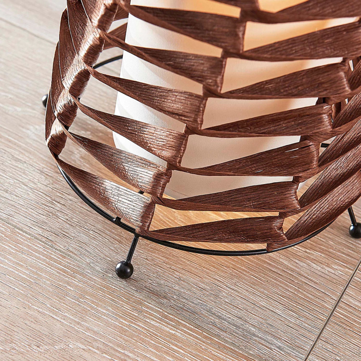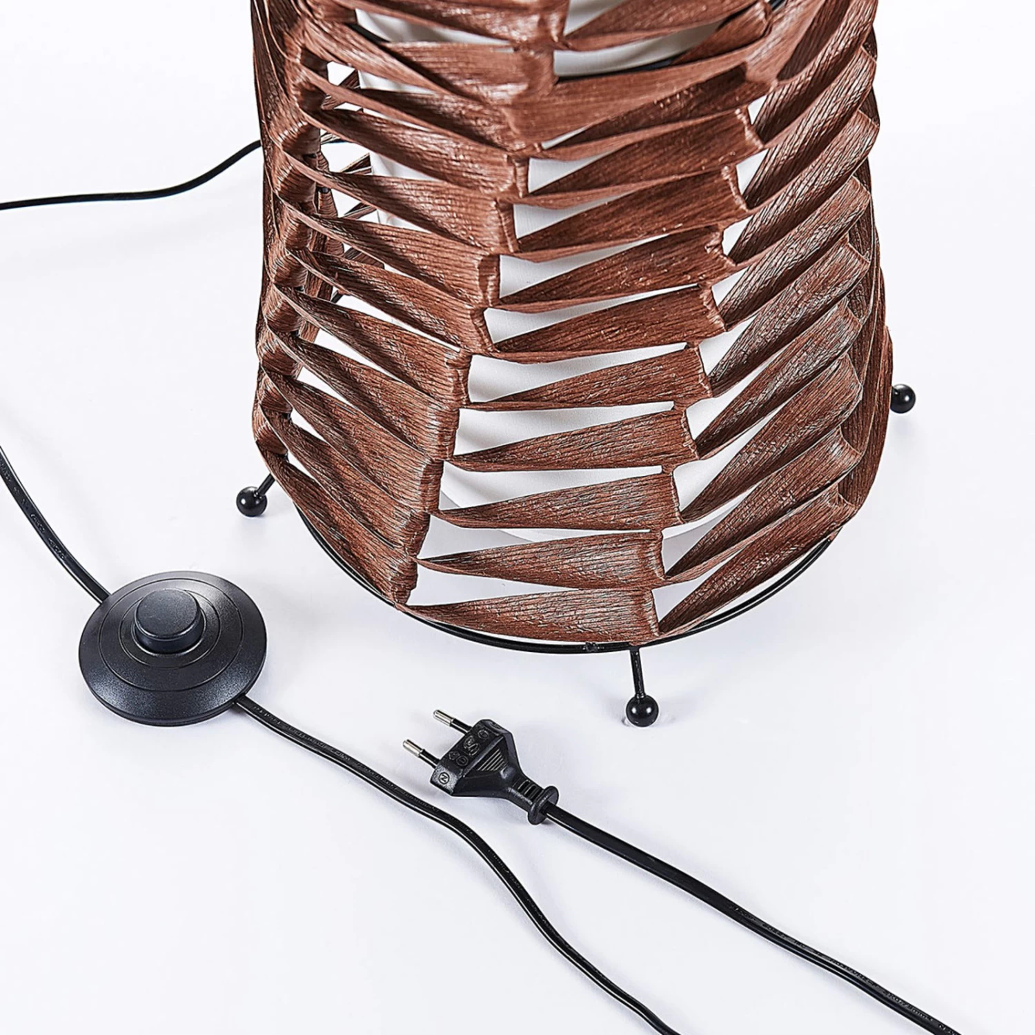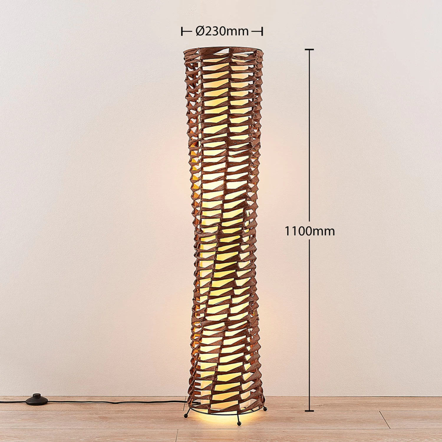 Lampadaire d’intérieur Joas avec une lumière confortable grâce à un abat-jour intérieur en textileJoas est un lampadaire à l’aspect naturel et au rayonnement chaleureux, dont l’abat-jour extérieur est tressé à partir d’éléments en papier solides torsadés de couleur brune. La technique de tressage laisse des espaces entre les éléments, de sorte que l’on peut assez facilement voir l’abat-jour en tissu à l’intérieur du lampadaire. Le tissu dessine une image lumineuse particulièrement douce, qui convient parfaitement à un éclairage confortable de l’espace de vie. En tant que source de lumière supplémentaire, le lampadaire est un véritable enrichissement dans le salon. Il produit une lumière agréable et peut être allumé le soir à la place de l’éclairage principal. Le câble d’alimentation à fiche a une longueur de 1,8 m.