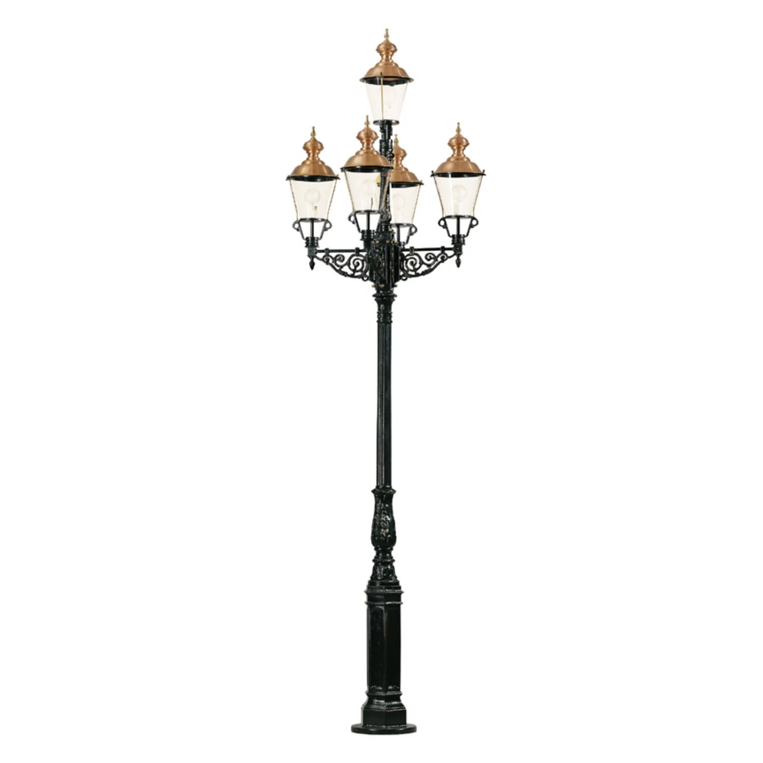 Candélabre à cinq flammes MONACO avec capuchons en cuivreL’imposant candélabre à lanterne en cuivre d’une hauteur de 375 cm est un bijou représentatif pour l’extérieur. Les cinq lanternes sont conçues en forme de cylindre avec d’élégants capots en cuivre. Le verre acrylique transparent assure un éclairage clair et sûr. Les ornements décoratifs supplémentaires sont très esthétiques. MONACO assure une grande sécurité et renforce l’aspect représentatif. Malgré un bon éclairage, l’espace extérieur est plongé dans une ambiance agréable. Le raccordement du luminaire se fait directement sur la douille. Il est recommandé de faire appel à un électricien spécialisé pour l’installation. Le fabricant conseille d’utiliser un câble en caoutchouc.
