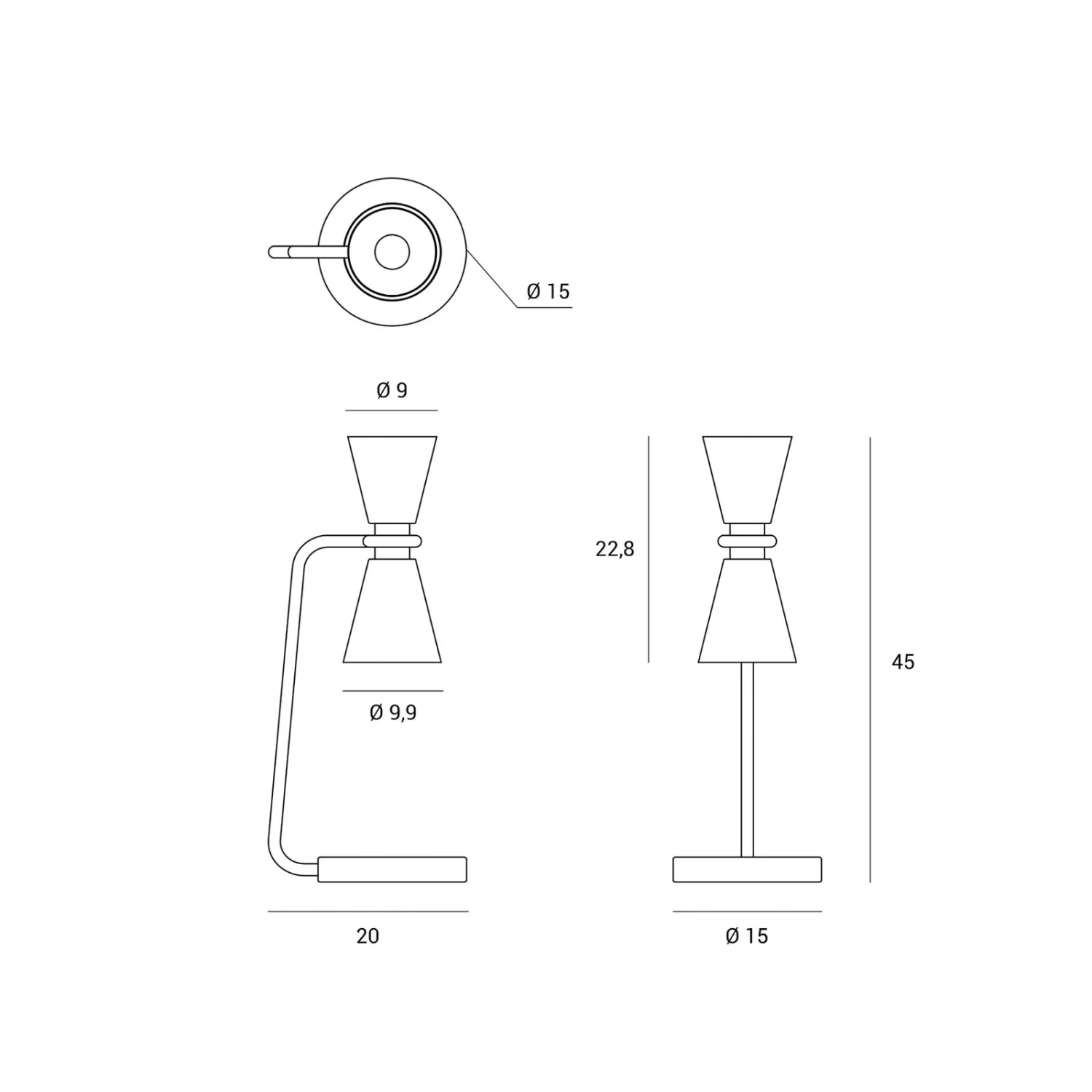 | Autres dimensions | abat-jour – hauteur 22,8 cm ; Ø haut 9 cm, Ø bas 9,9 cm ; Ø pied 15 cm |