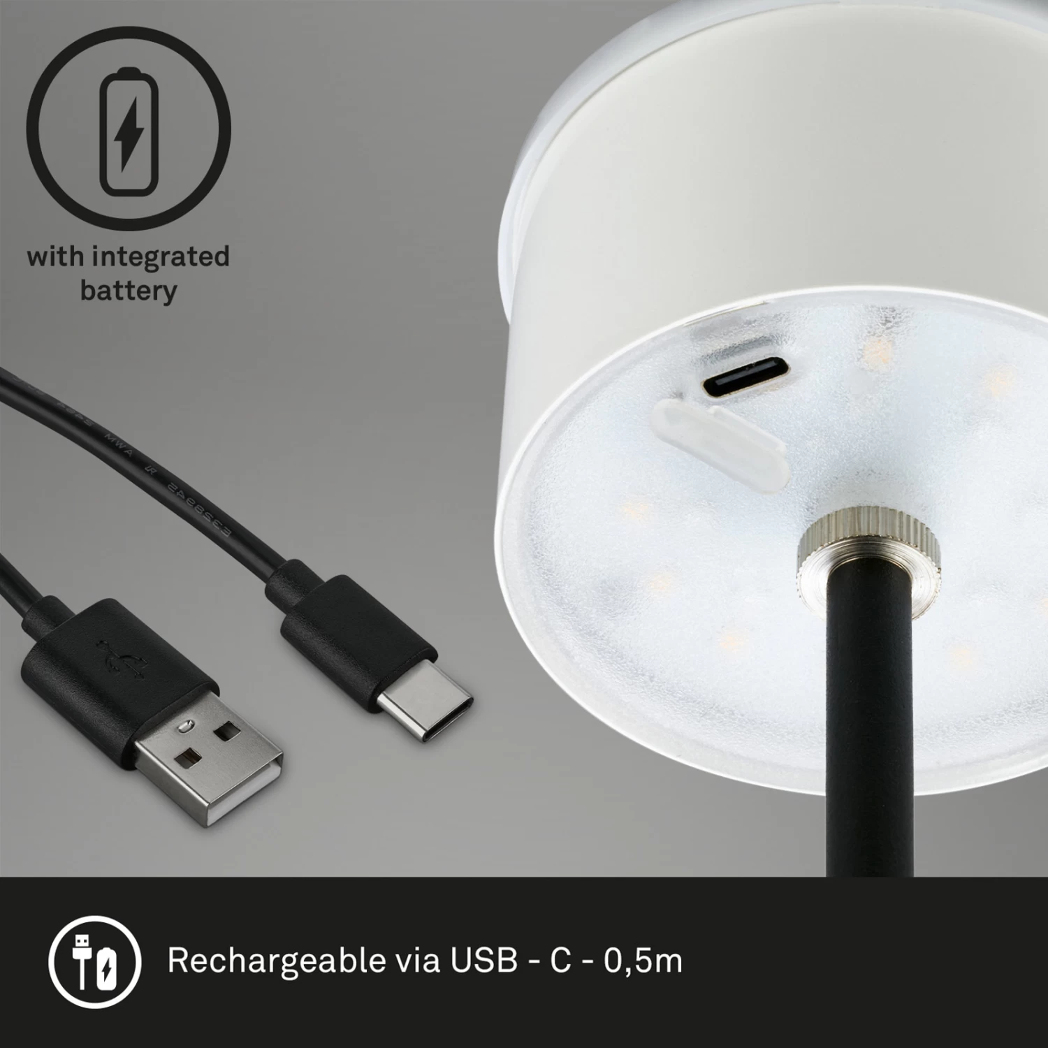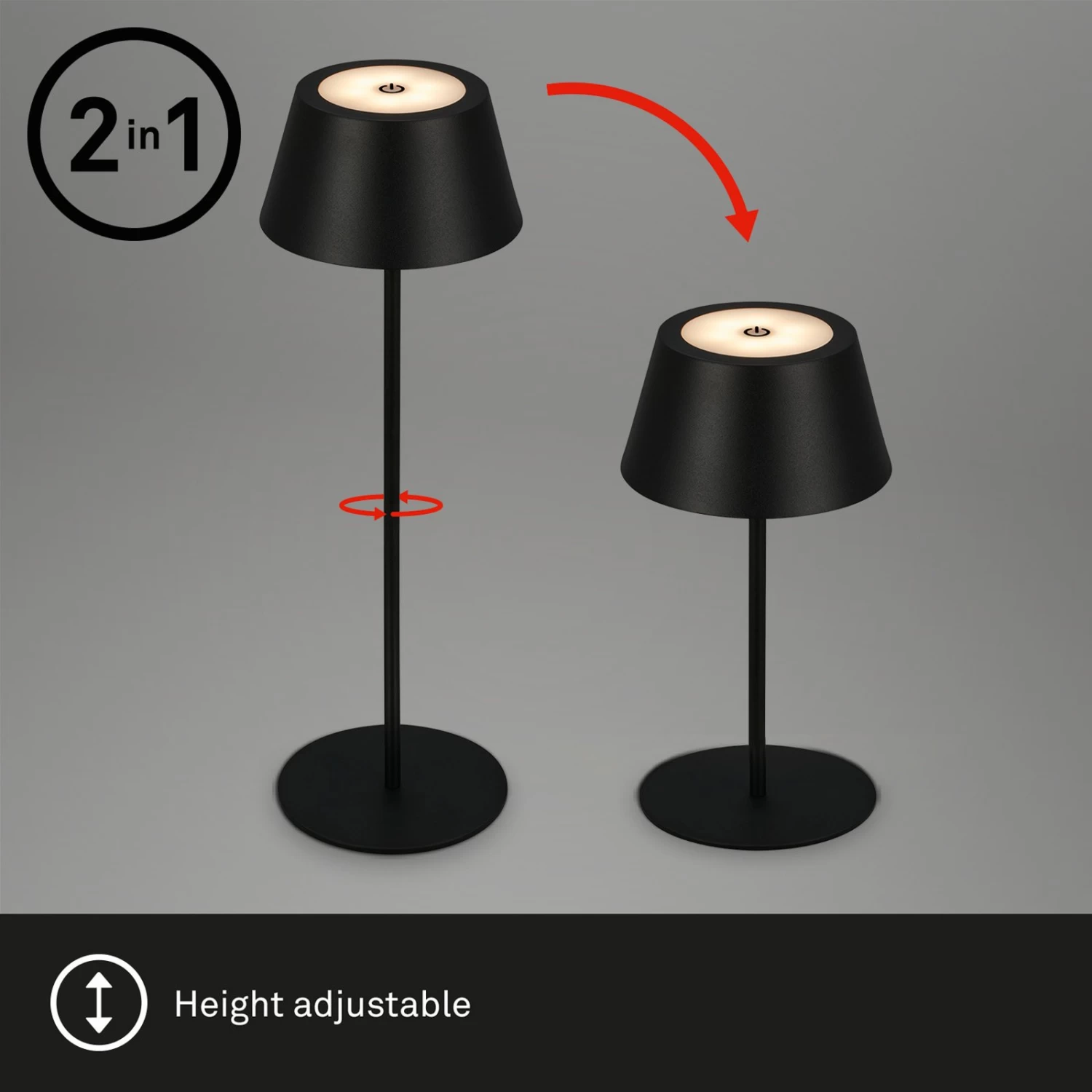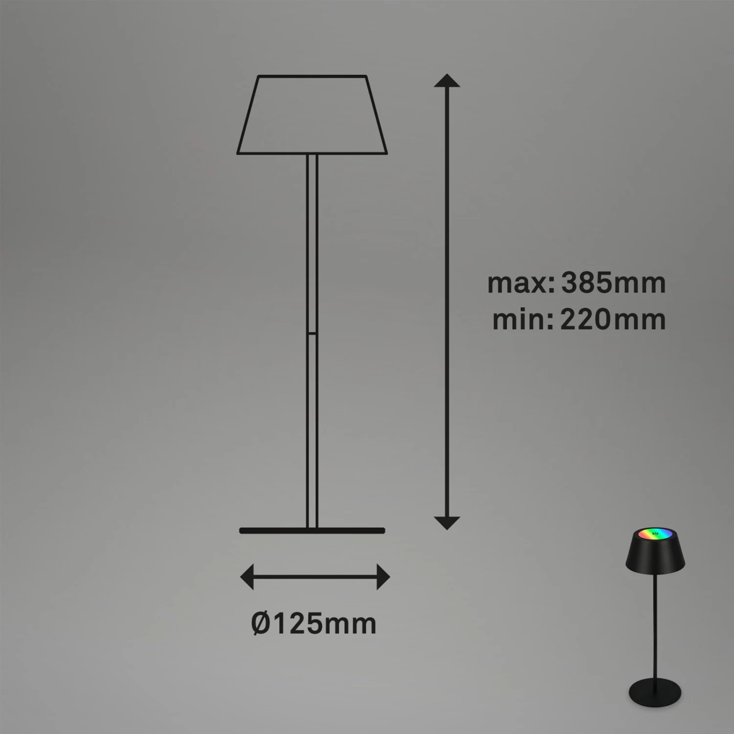 Lampe de table LED Kiki RGBW avec accu à hauteur de montage variableKiki est une lampe de table LED alimentée par accu pour l’intérieur ou l’extérieur (type de protection IP44), qui peut éclairer aussi bien en couleurs vives qu’en lumière blanche chaude. La tige en deux parties de la lampe avec des raccords à vis permet de varier la hauteur de la lampe. Si une seule tige est montée, la hauteur de la lampe de table est de 22 cm, si les deux tiges sont montées, la hauteur est de 38,5 cm.La lampe de table est livrée avec un câble de chargement USB sans bloc d’alimentation et peut être commandée par l’interrupteur tactile placé sur l’abat-jour. Une première activation fait passer la lampe en éclairage blanc chaud avec une intensité lumineuse maximale, deux activations activent le changement de couleur des LED avec une intensité lumineuse réduite et une troisième activation arrête le changement de couleur et l’intensité lumineuse diminue à nouveau. La quatrième commutation entraîne l’extinction.
