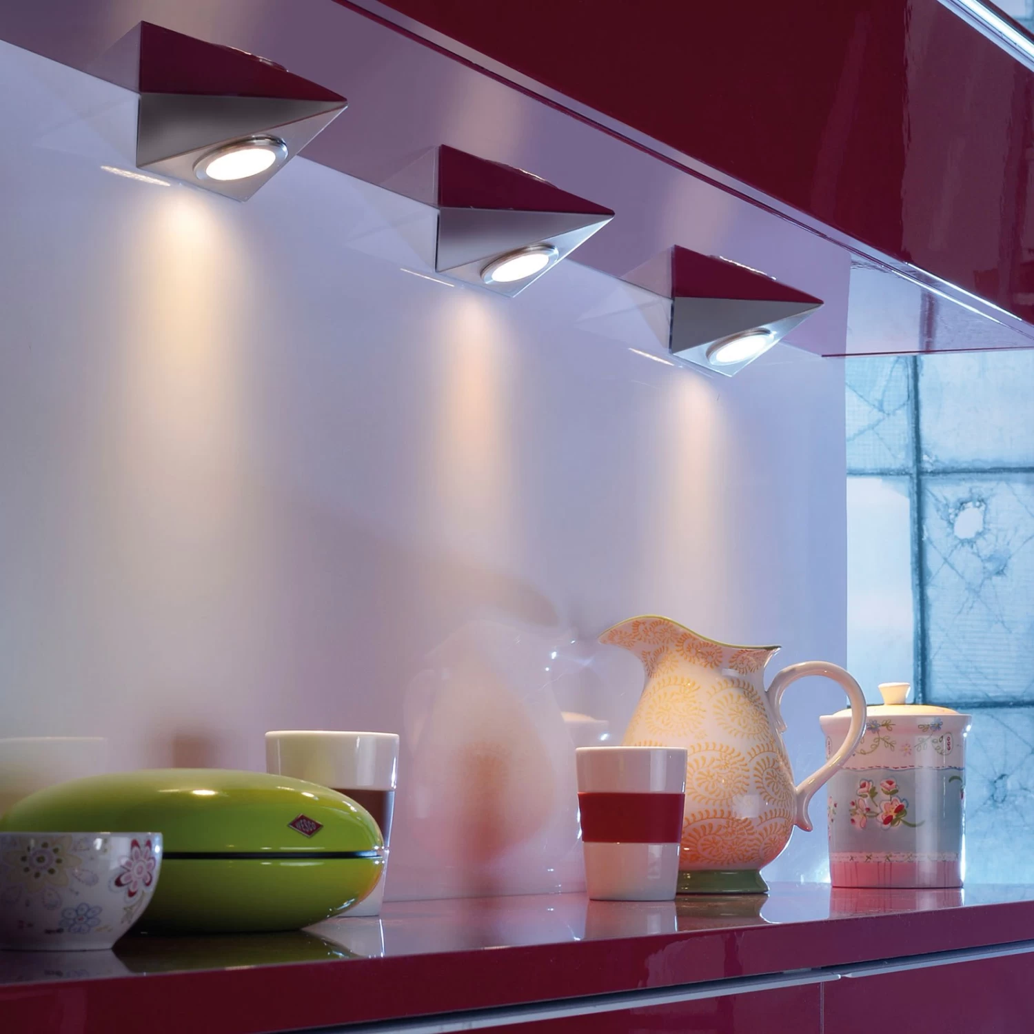 La lampe LED triangulaire pour meuble Helena est idéale pour l’éclairage blanc chaud du plan de travail dans la cuisine. Les luminaires individuels sont alimentés par un câble d’alimentation commun avec fiche et sont reliés entre eux par des câbles (180 cm chacun) avec connecteurs, ce qui permet de les installer de manière flexible à différents endroits sous les armoires suspendues, etc. Le premier des luminaires est équipé d’un interrupteur à bascule qui permet d’allumer et d’éteindre les trois exemplaires.