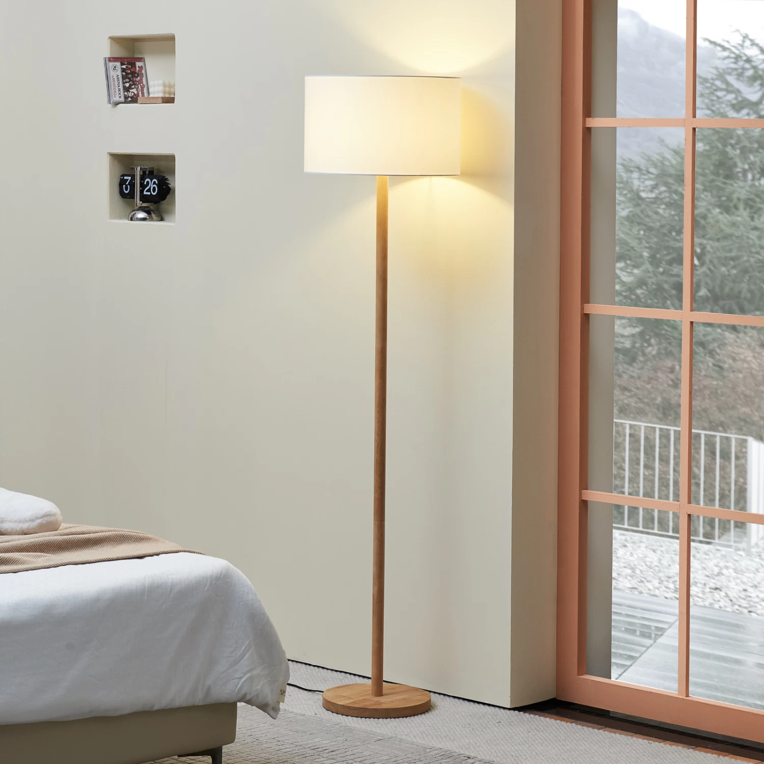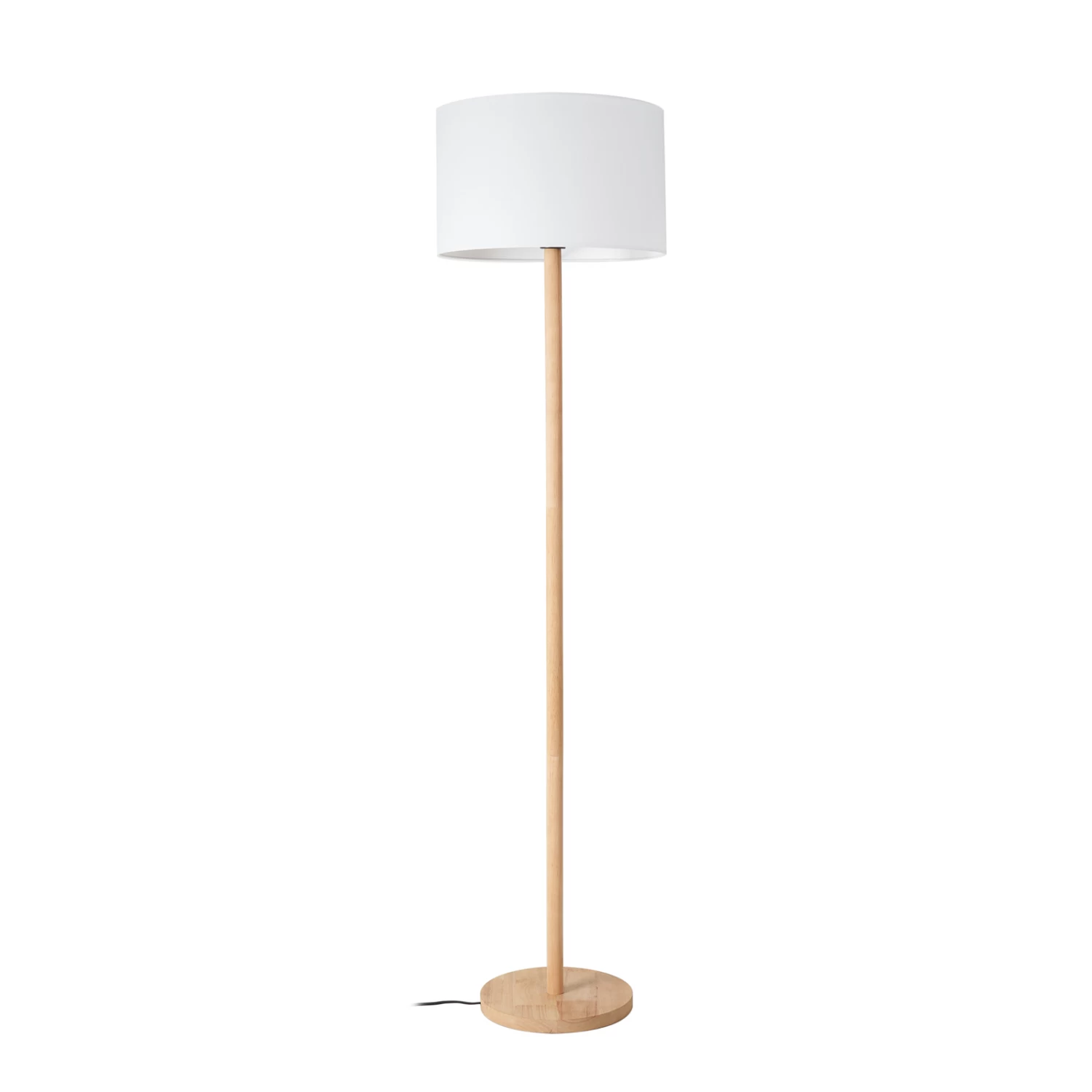 Lampadaire élancé Chava avec pied en bois et abat-jour en textile