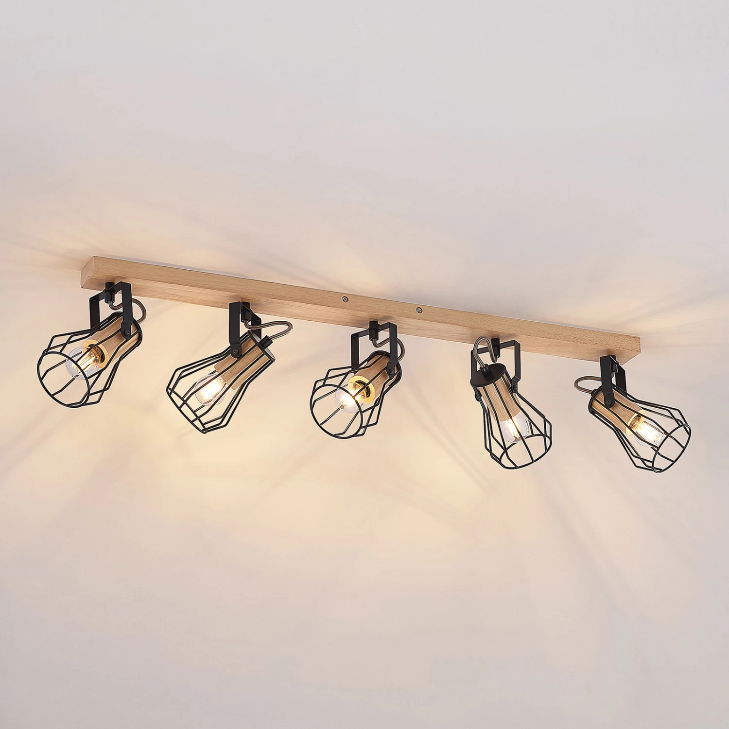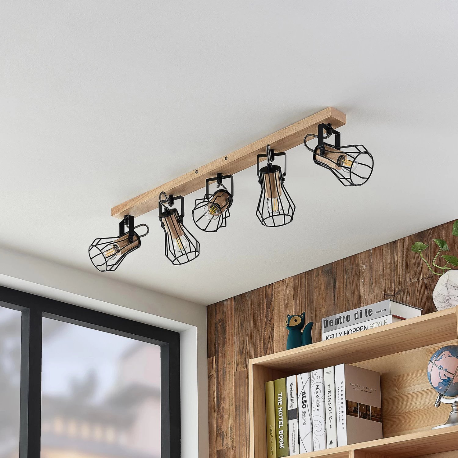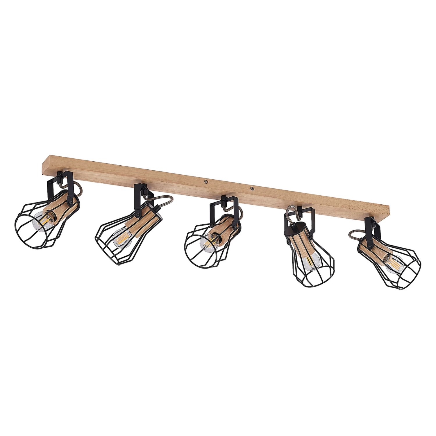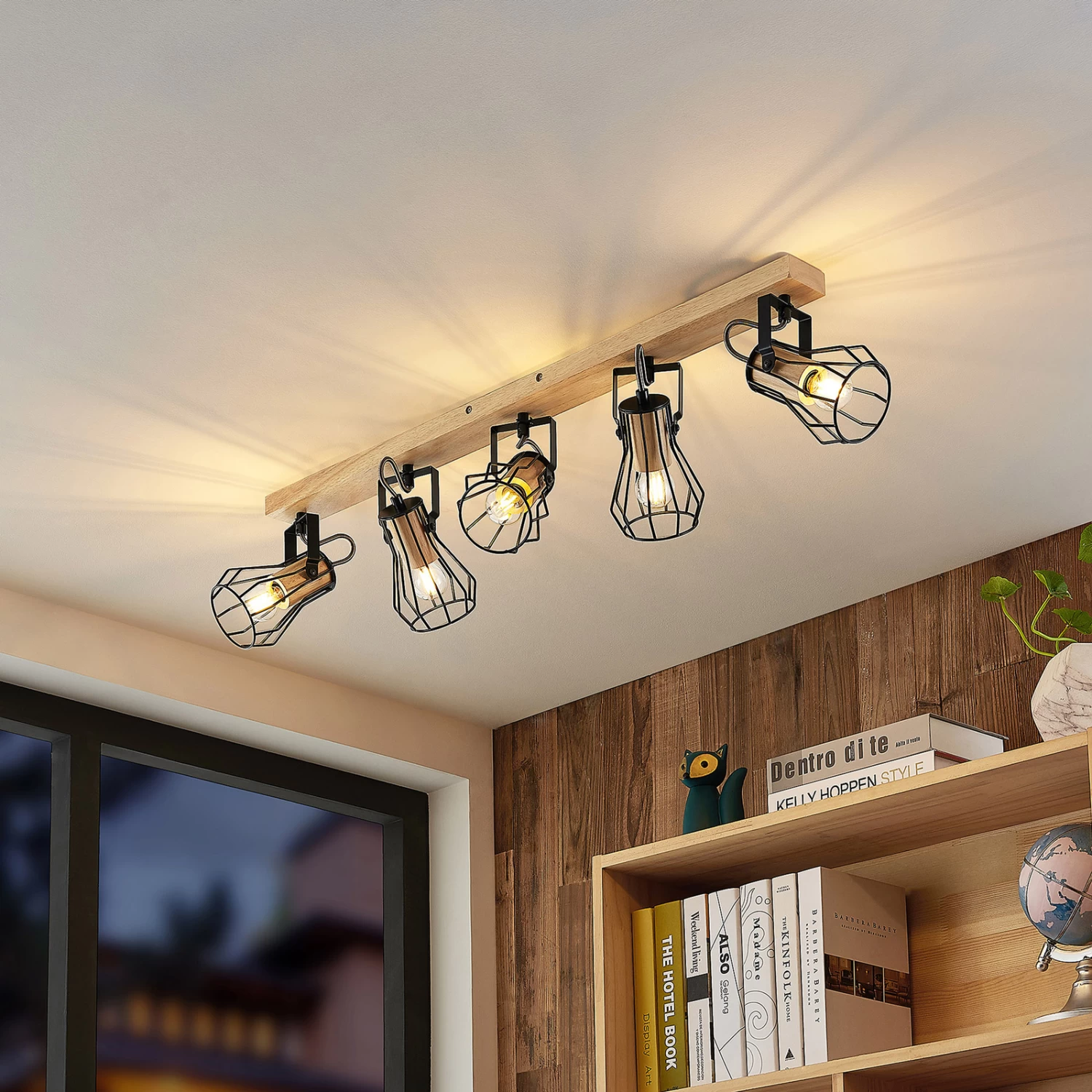 Plafonnier à cinq lampes Courtney avec plaque en bois et abat-jour en forme de cage en acier