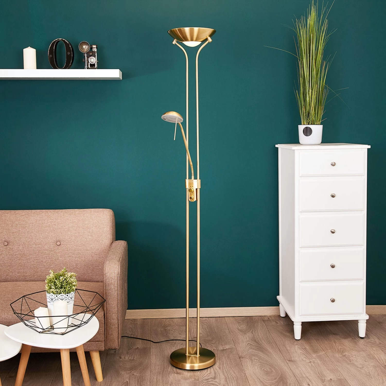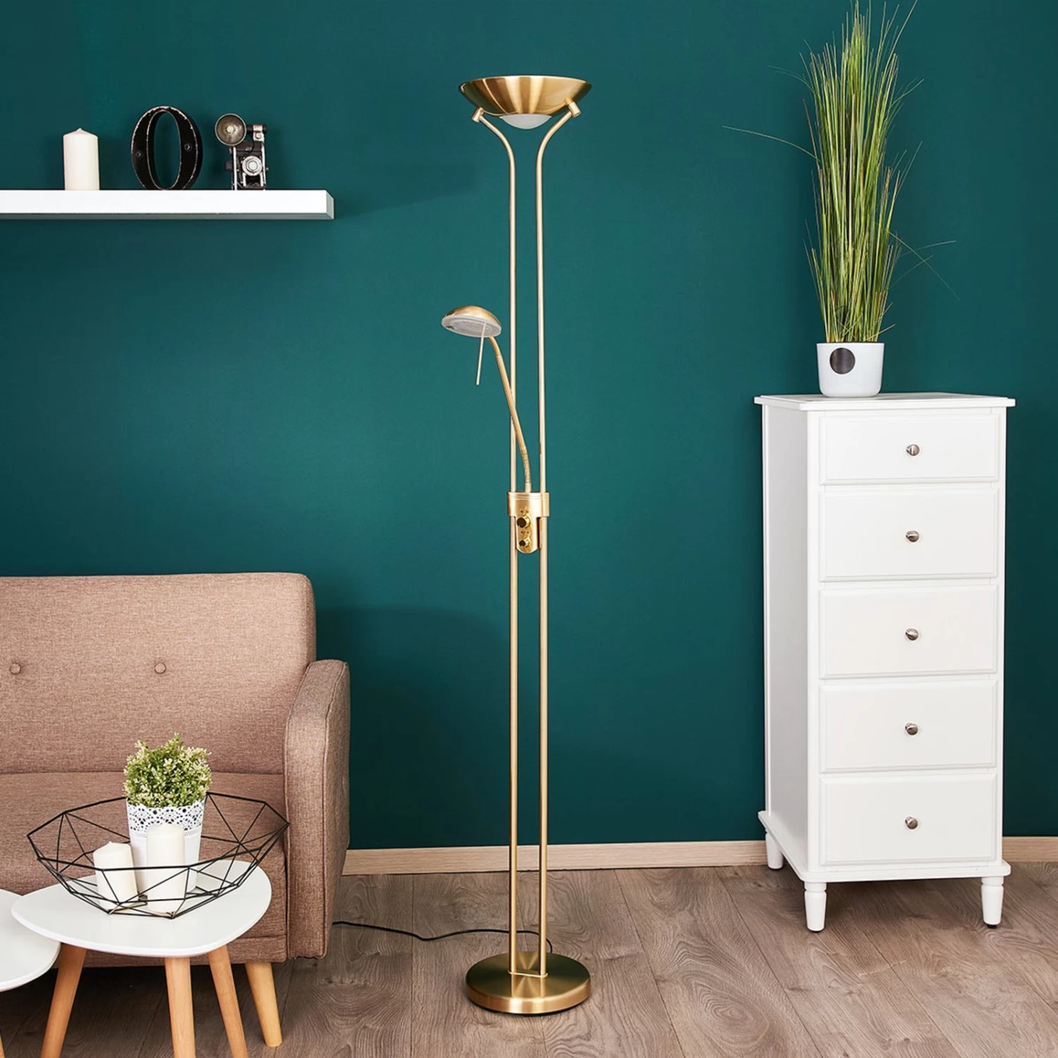 Lampadaire LED Josefin en laiton avec 2 variateurs de lumièreJosefin, avec sa finition en laiton, s’intègre parfaitement dans les intérieurs classiques où il constitue également un complément très utile d’un point de vue fonctionnel. Le lampadaire LED n’est pas seulement équipé d’un projecteur qui fournit une lumière agréable, mais il intègre également une lampe de lecture qui remplit également une bonne fonction. Nombreux sont ceux qui aiment s’installer confortablement sur le canapé le soir et qui apprécient la lumière émanant d’un projecteur. Mais si l’on souhaite tout de même se consacrer à la lecture d’un livre, cette lumière est sans aucun doute trop diffuse et pas assez ciblée. C’est là qu’intervient la liseuse, qui peut être commandée séparément et se trouve sur un bras mobile à mi-hauteur de la structure. Elle offre une lumière claire et ponctuelle qui soulage les yeux pendant la lecture. Pour une fonctionnalité encore plus grande, deux variateurs se trouvent sur le support de la lampe et permettent un réglage continu de la luminosité.