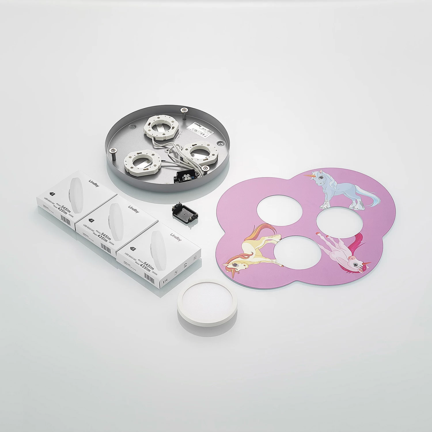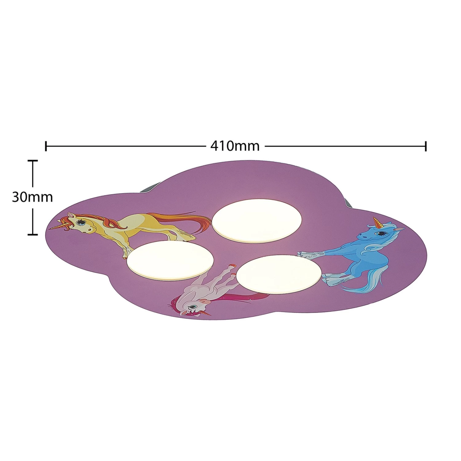 Thorke diffuse une ambiance ludique et convient parfaitement à une chambre d’enfant. Son corps de lampe en forme de nuage est en fer peint en rose et est orné de trois licornes d’aspect différent. En outre, le plafonnier LED est livré avec des ampoules à intensité variable qui assurent toujours la bonne lumière. Grâce à un interrupteur mural, il est possible d’allumer et d’éteindre le luminaire comme d’habitude. Grâce à la technique de variation à 3 niveaux avec fonction off intégrée, il est en outre possible de faire varier l’intensité lumineuse sur trois niveaux différents en actionnant plusieurs fois l’interrupteur : 100 %, 50 % et 3 %. Le plafonnier Thorke s’intègre sans peine dans un style d’aménagement insouciant dans la chambre d’enfant et fait battre le cœur de tous les fans de licornes.