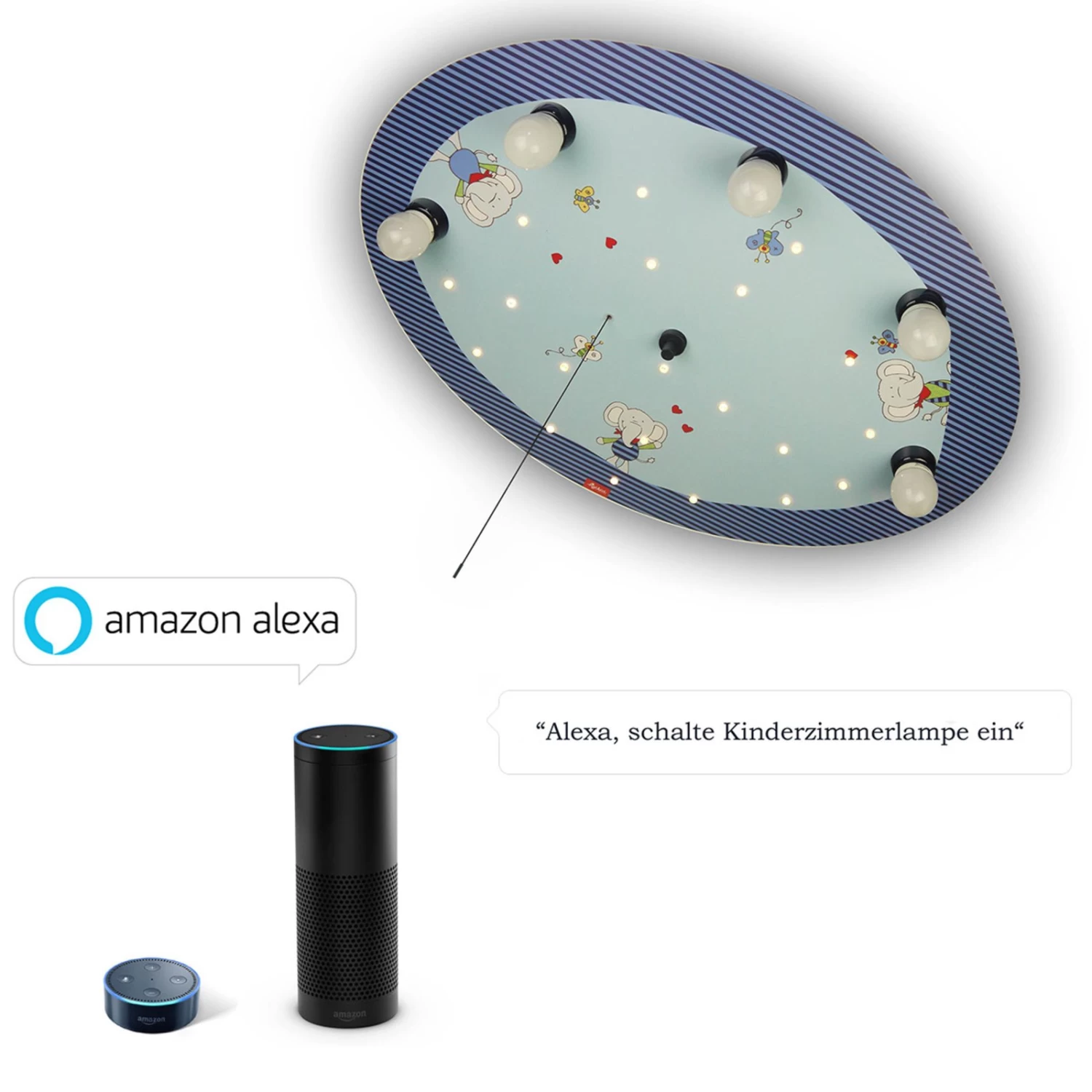 Le plafonnier Lolo Lombardo pour les chambres d’enfants est équipé d’un module Alexa, de sorte qu’il fonctionne également avec la commande vocale du même nom.