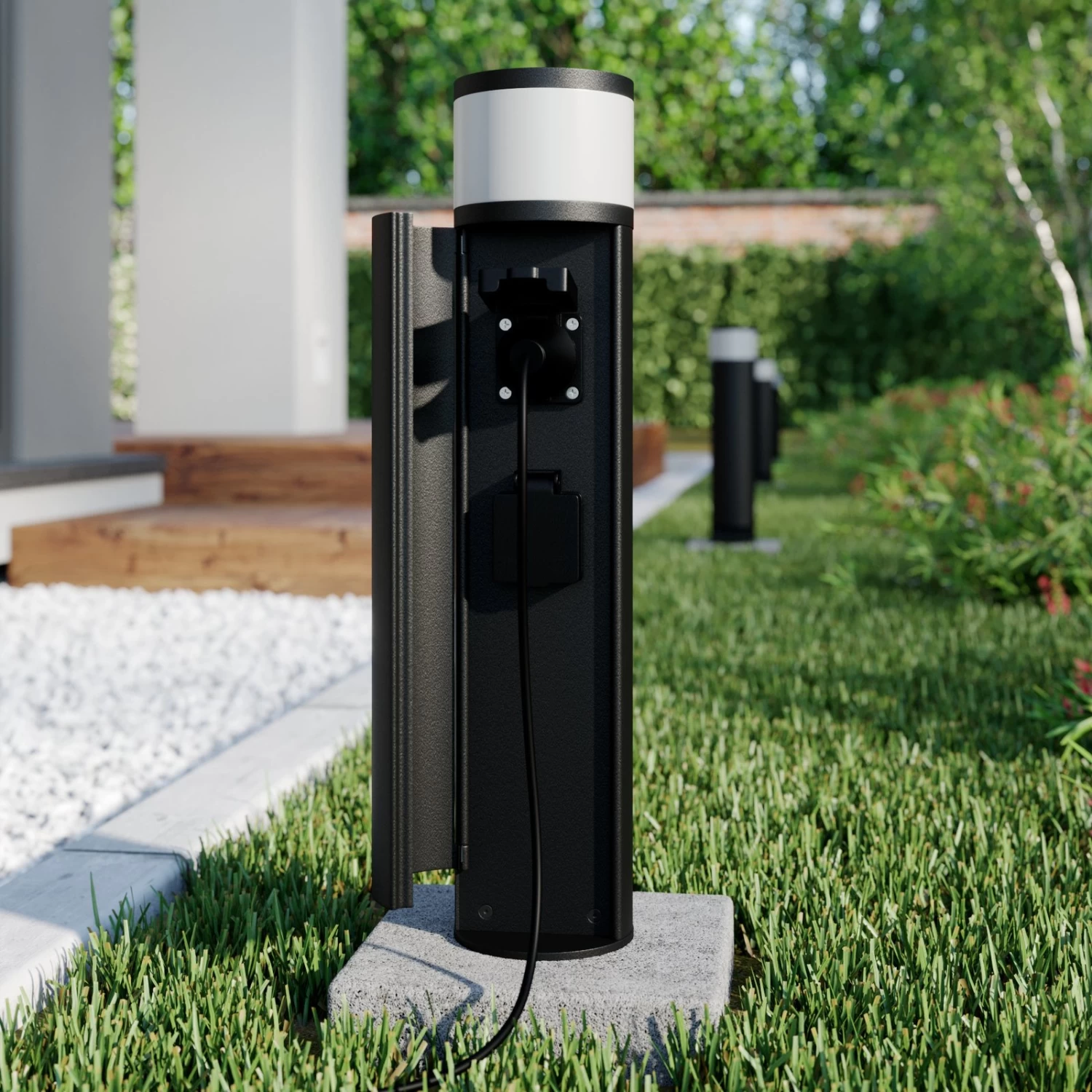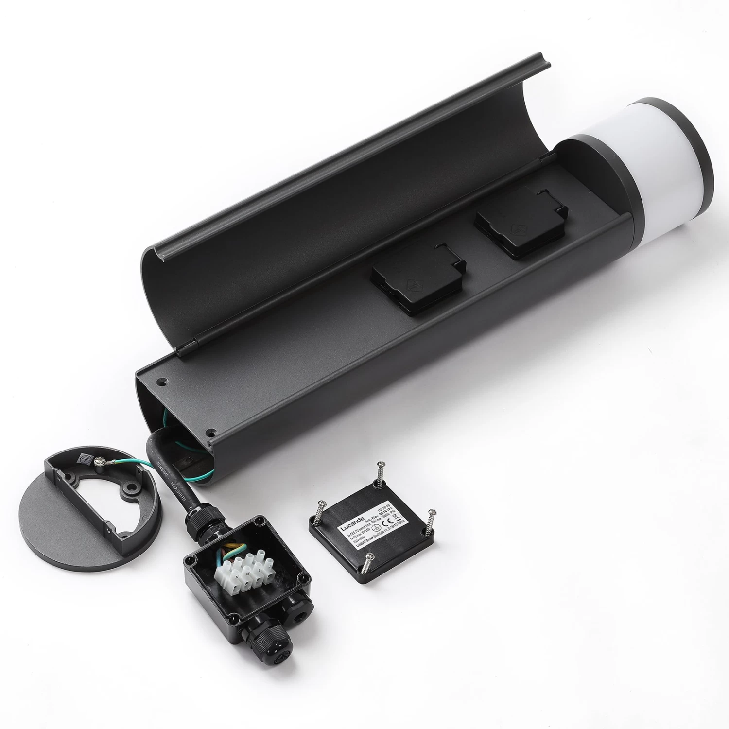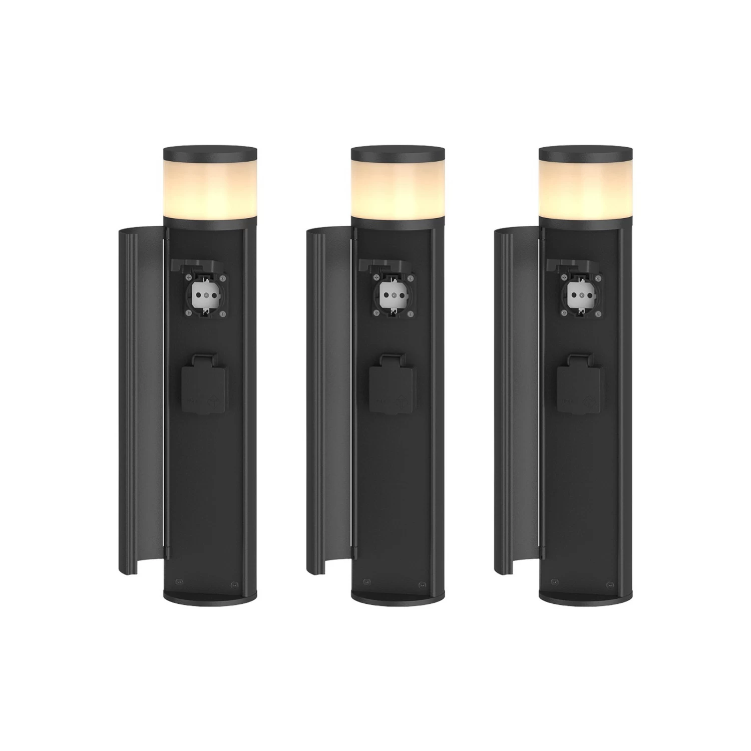 Lampe de socle Corban avec deux prises de courant en set de 3La lampe de socle Corban n’apporte pas seulement de la lumière dans l’obscurité, mais met également à disposition une alimentation électrique à l’extérieur. Le luminaire a un corps élancé en aluminium dans lequel sont intégrées deux prises de courant pour une puissance totale maximale de 3.680 watts, dissimulées derrière une porte. Un diffuseur blanc est encastré à l’extrémité supérieure du luminaire, ce qui assure une répartition uniforme de la lumière.Ici, Corban est disponible en pack pratique de 3.
