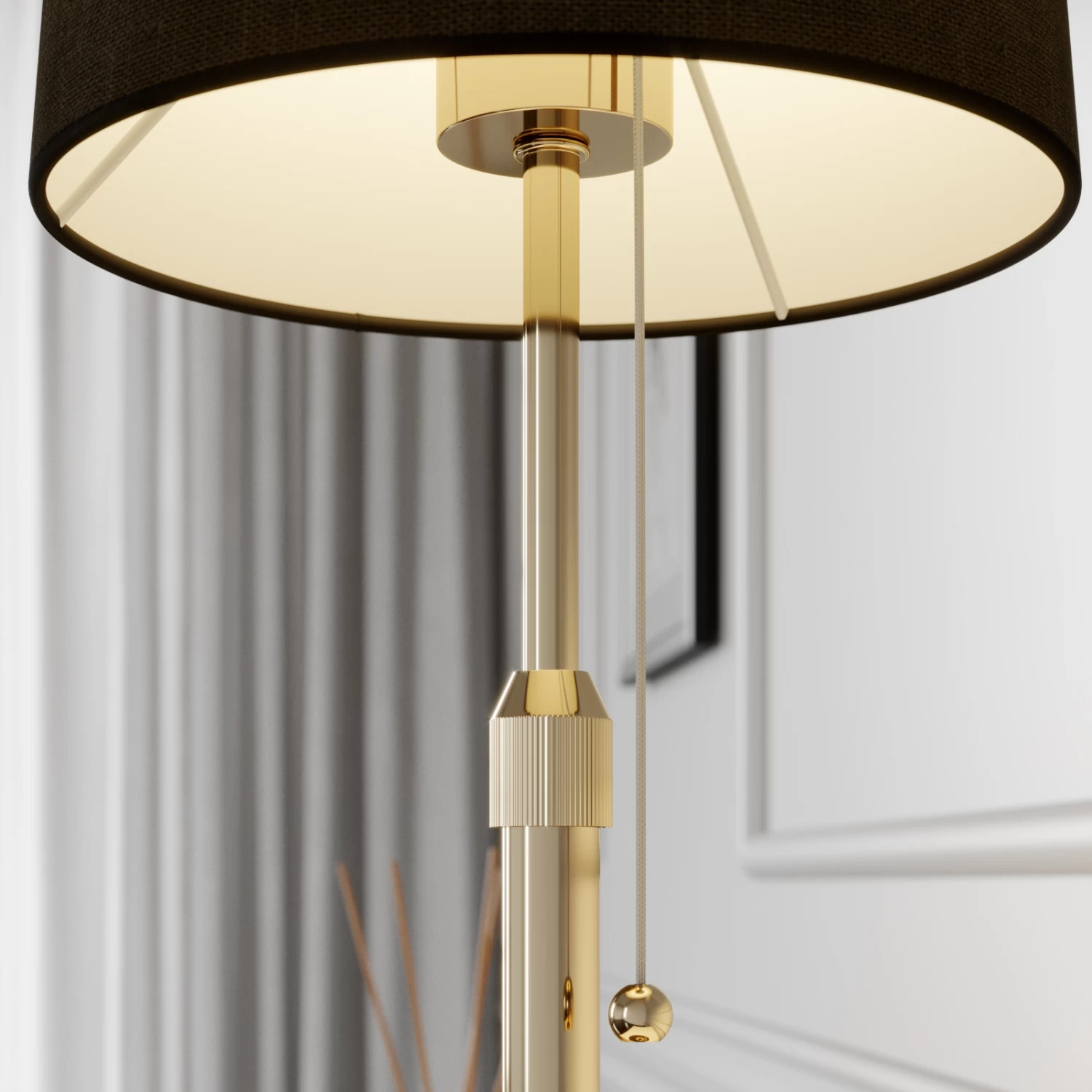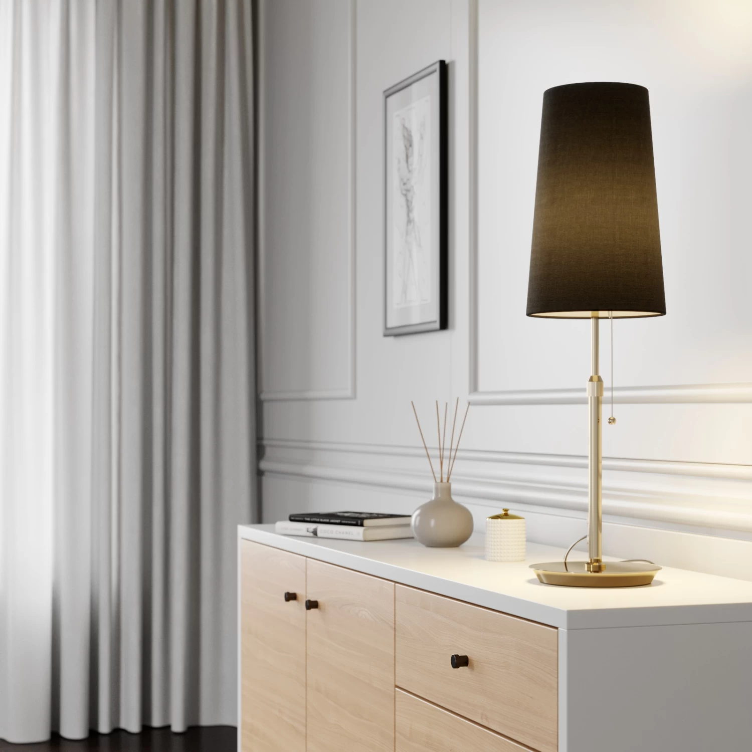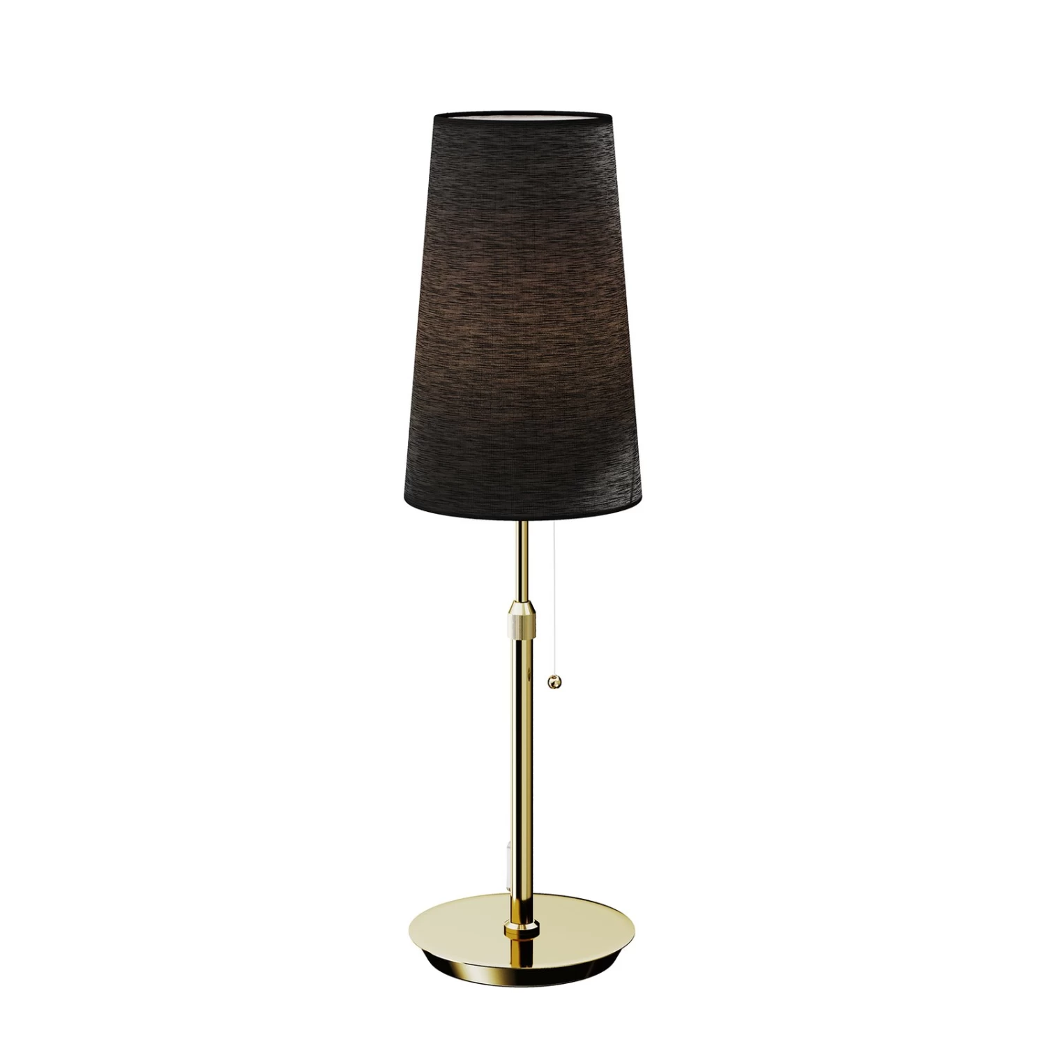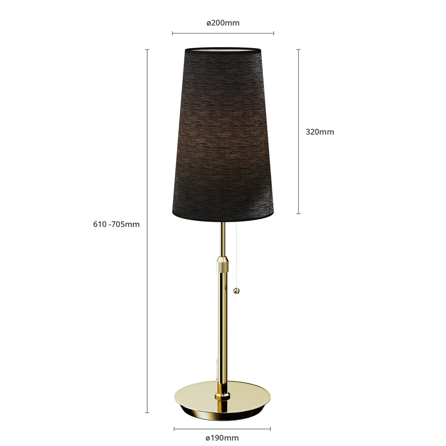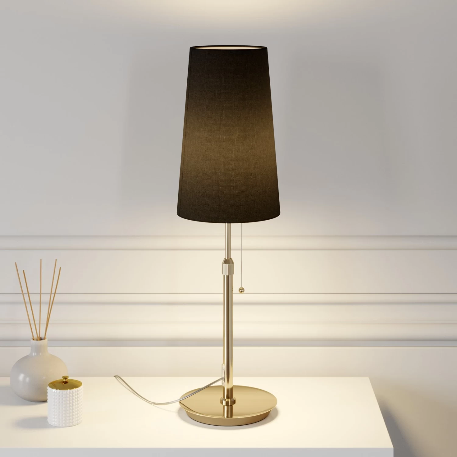 Lampe de table Pordis étroite avec abat-jour en tissu noir et support métallique en laiton, réglable en hauteur