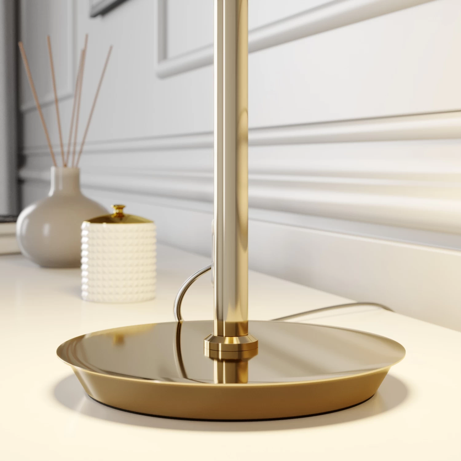 Avec son support en laiton, Pordis s’intègre parfaitement dans des aménagements classiques. L’abat-jour en tissu noir complète avec style le design de cette lampe à poser et garantit une lumière tamisée à l’effet confortable. Ainsi, Pordis se prête bien à l’éclairage d’accentuation dans les pièces de vie, quand le confort doit être au premier plan et qu’il n’y a plus besoin d’un éclairage lumineux. La hauteur du support peut être ajustée de 61 cm à 70,5 cm au moyen d’une armature télescopique et peut donc s’adapter aux conditions sur place. Avec sa grande hauteur, la lampe de table Pordis convient également comme lampe à poser. La lampe est allumée par un interrupteur à tirette élégant qui complète parfaitement l’ensemble du design.