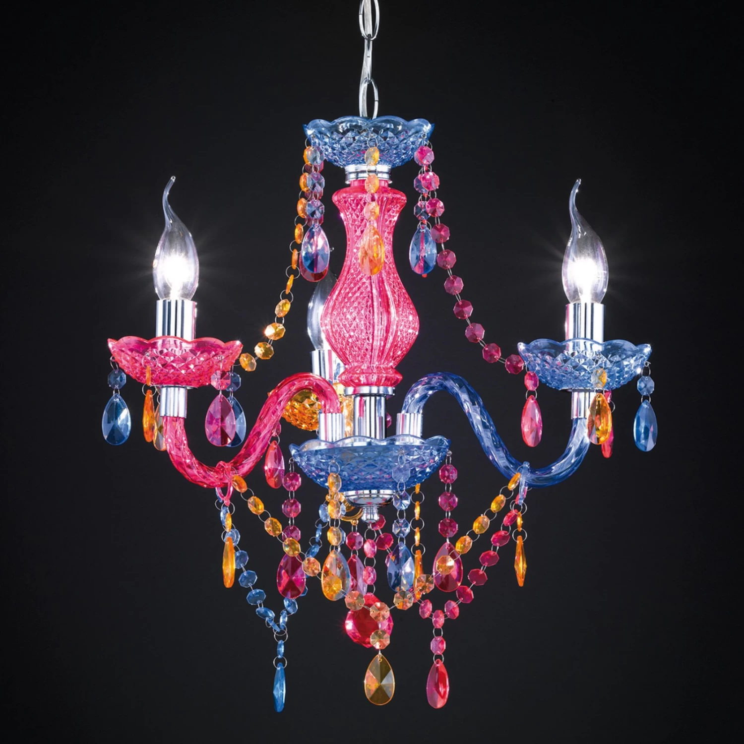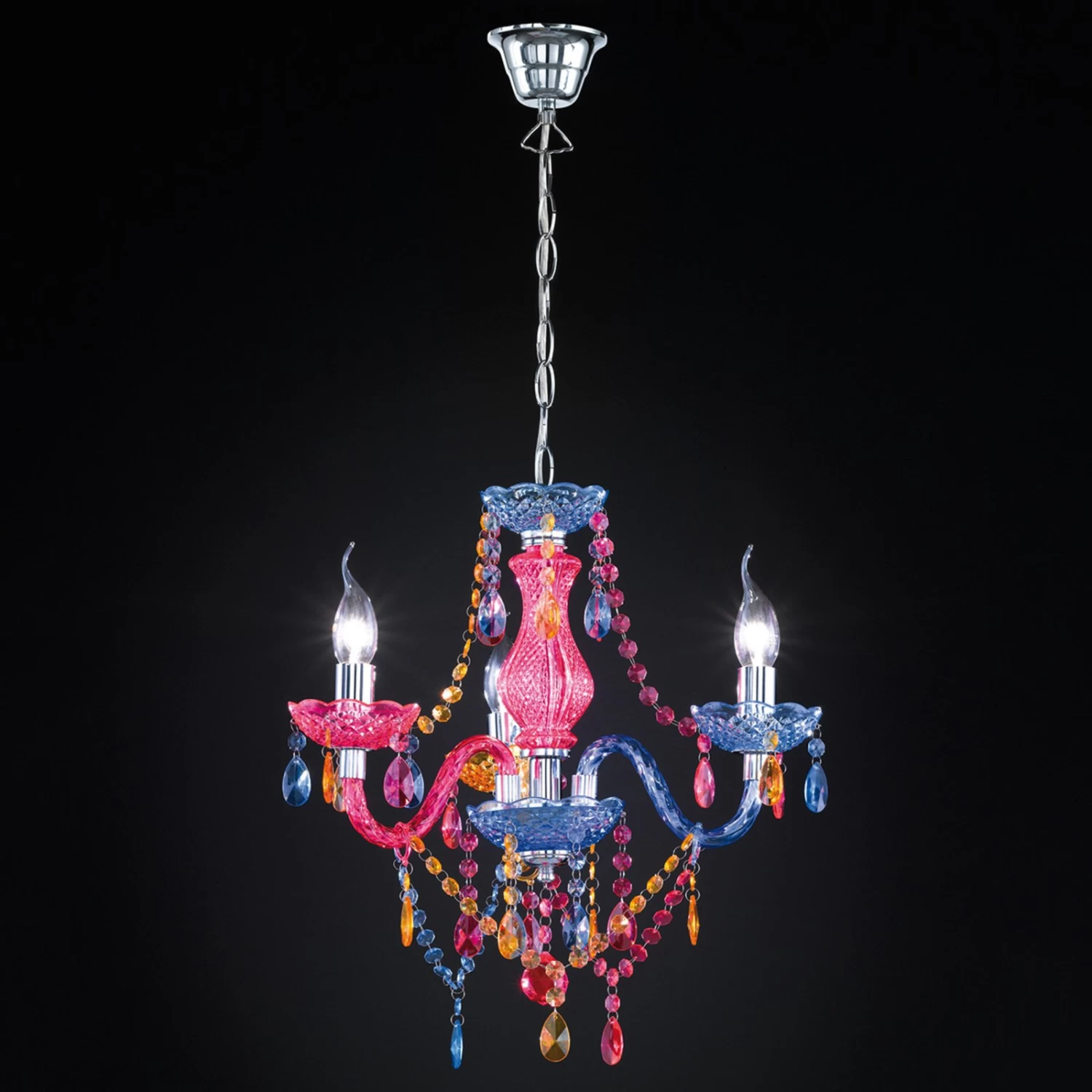 Pour un décor de rêve : le lustre coloré PerditaSes couleurs vives attirent le regard comme par magie : Perdita est un lustre à trois lampes dont la structure en métal chromé brillant, merveilleusement incurvée, rivalise avec la tenture en acrylique scintillant sous la lumière dans des tons bleus, roses et orange. C’est le choix idéal pour une chambre de fille ou d’adolescente funky ou pour les personnes qui souhaitent décorer leur intérieur de manière originale. Les bougies coup de vent sont ravissantes en tant qu’ampoules et renforcent l’effet du design. Livraison sans ampoules (à commander via les accessoires).