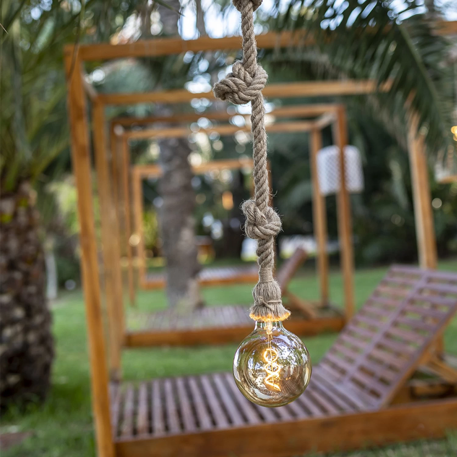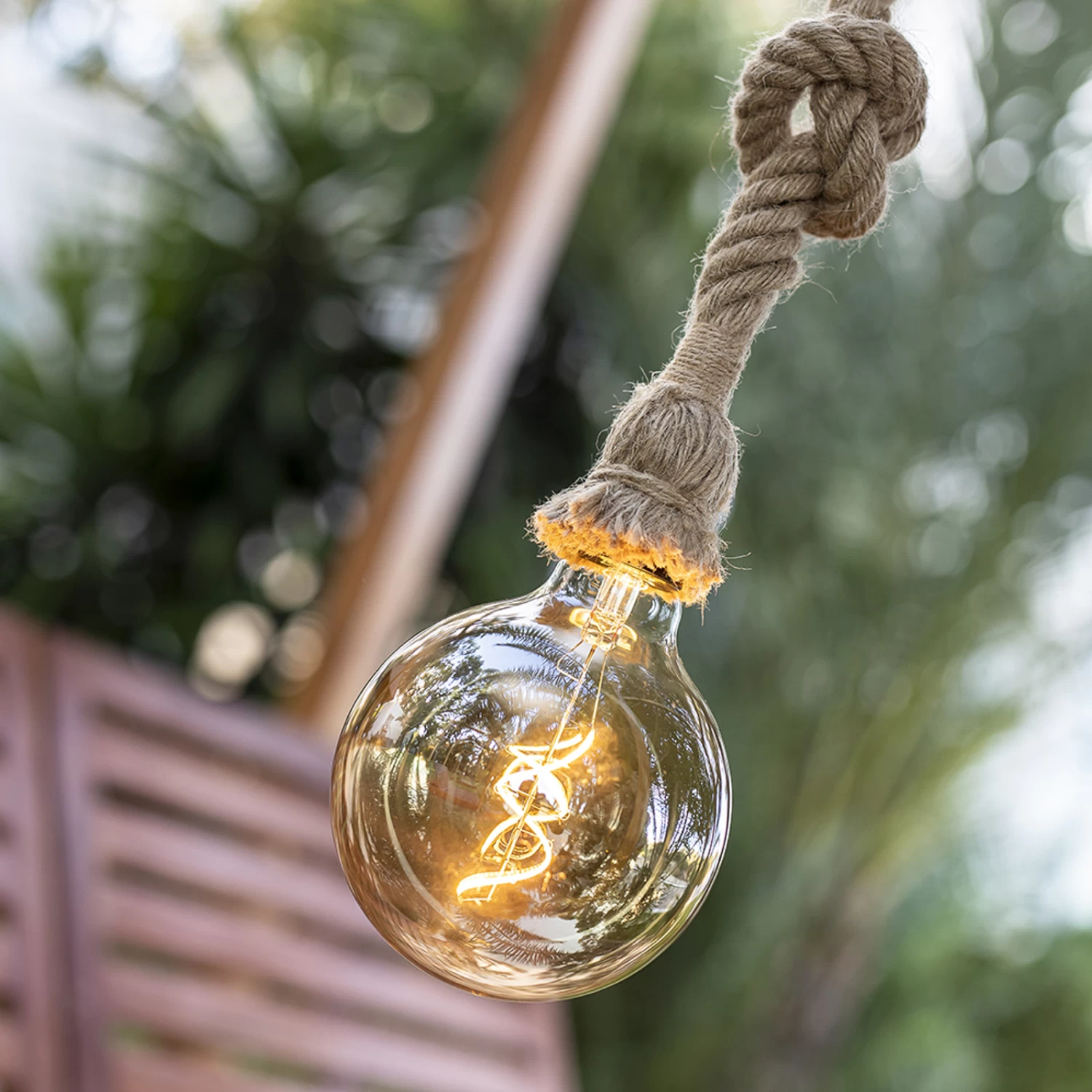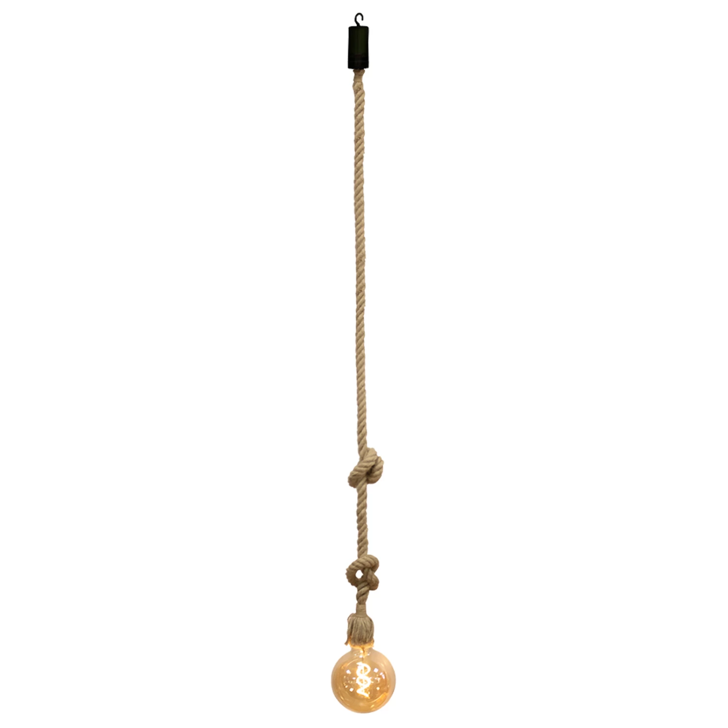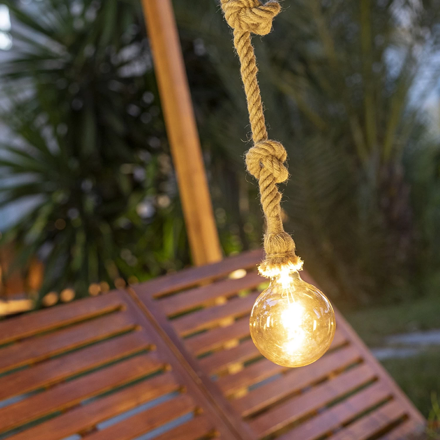 La suspension solaire LED Simona se compose d’une longue suspension en jute qui rappelle une corde. Il est possible de varier la longueur de la corde en insérant des nœuds aux endroits souhaités. Un crochet de suspension se trouve également sur le dessus de la lampe. Simona est alimentée par un panneau solaire qui se recharge à la lumière du soleil. La lampe à suspendre peut également être rechargée via le câble USB fourni. Grâce au type de protection IP44, il est possible d’utiliser la lampe suspendue à l’intérieur et à l’extérieur. La télécommande fournie permet en outre d’ajuster la luminosité. L’ampoule LED peut être remplacée.