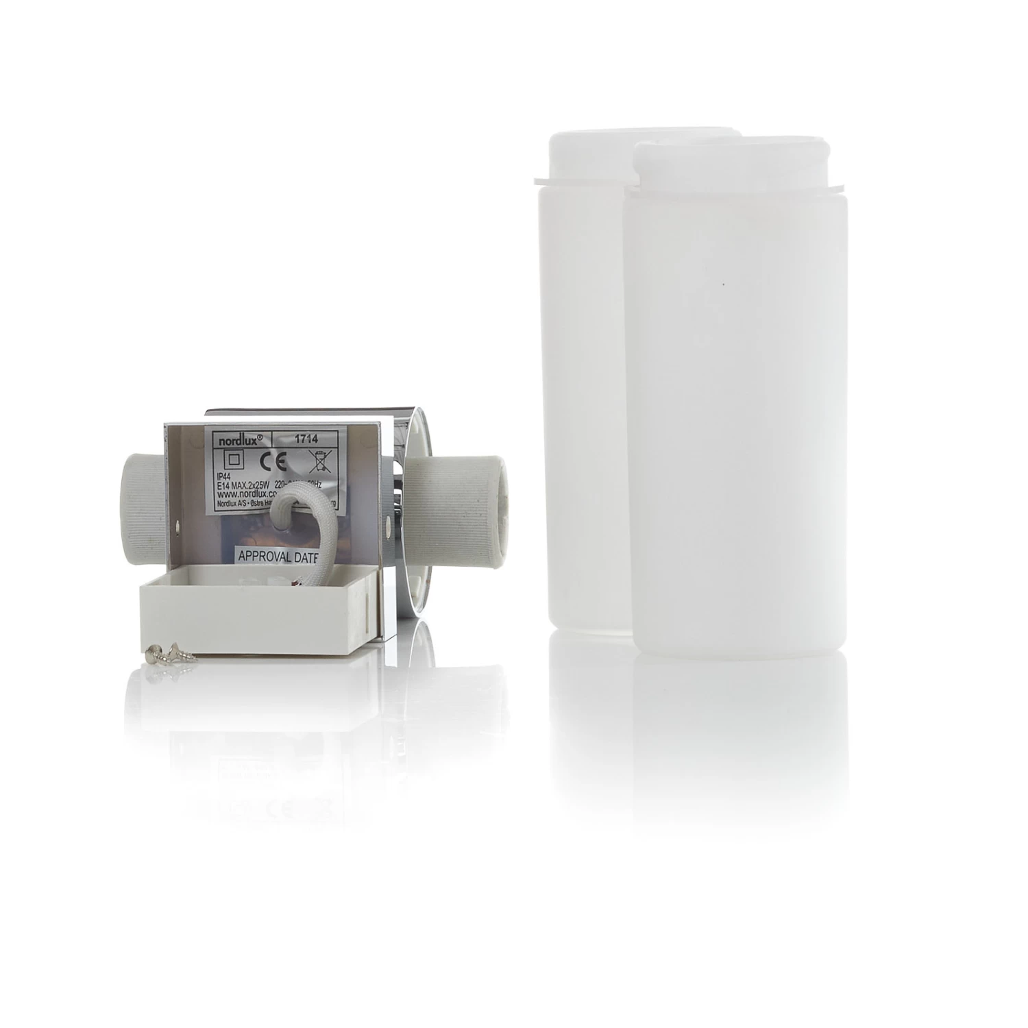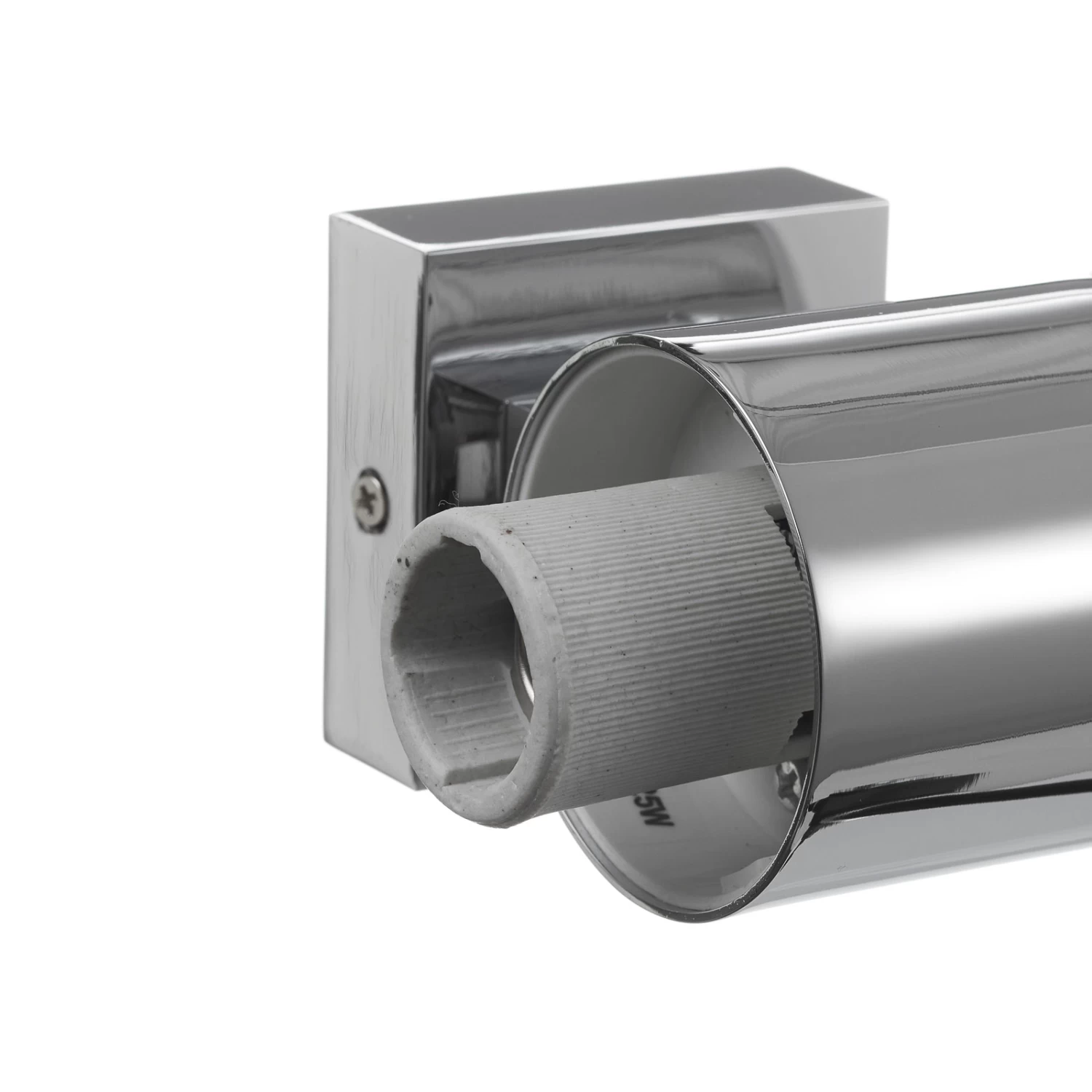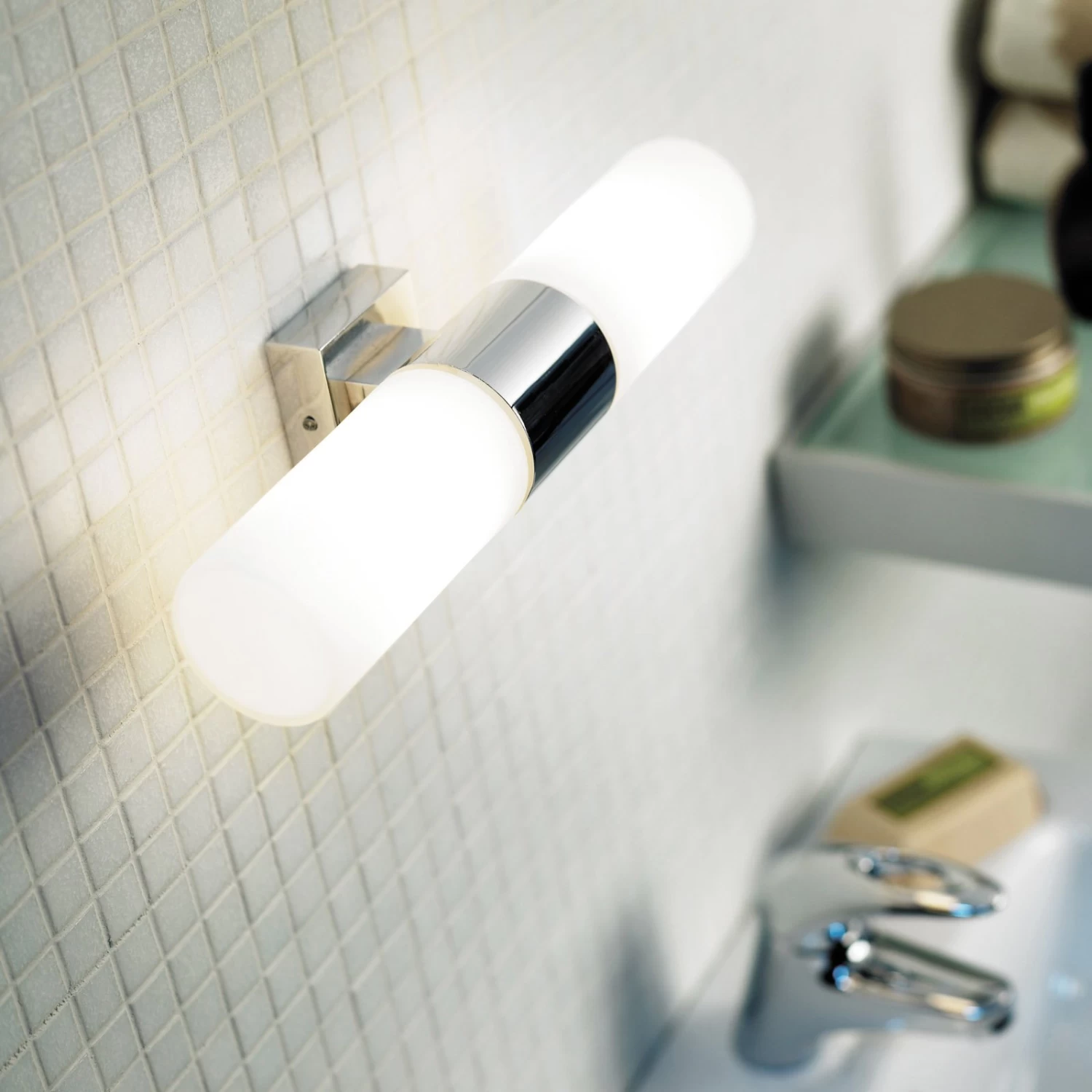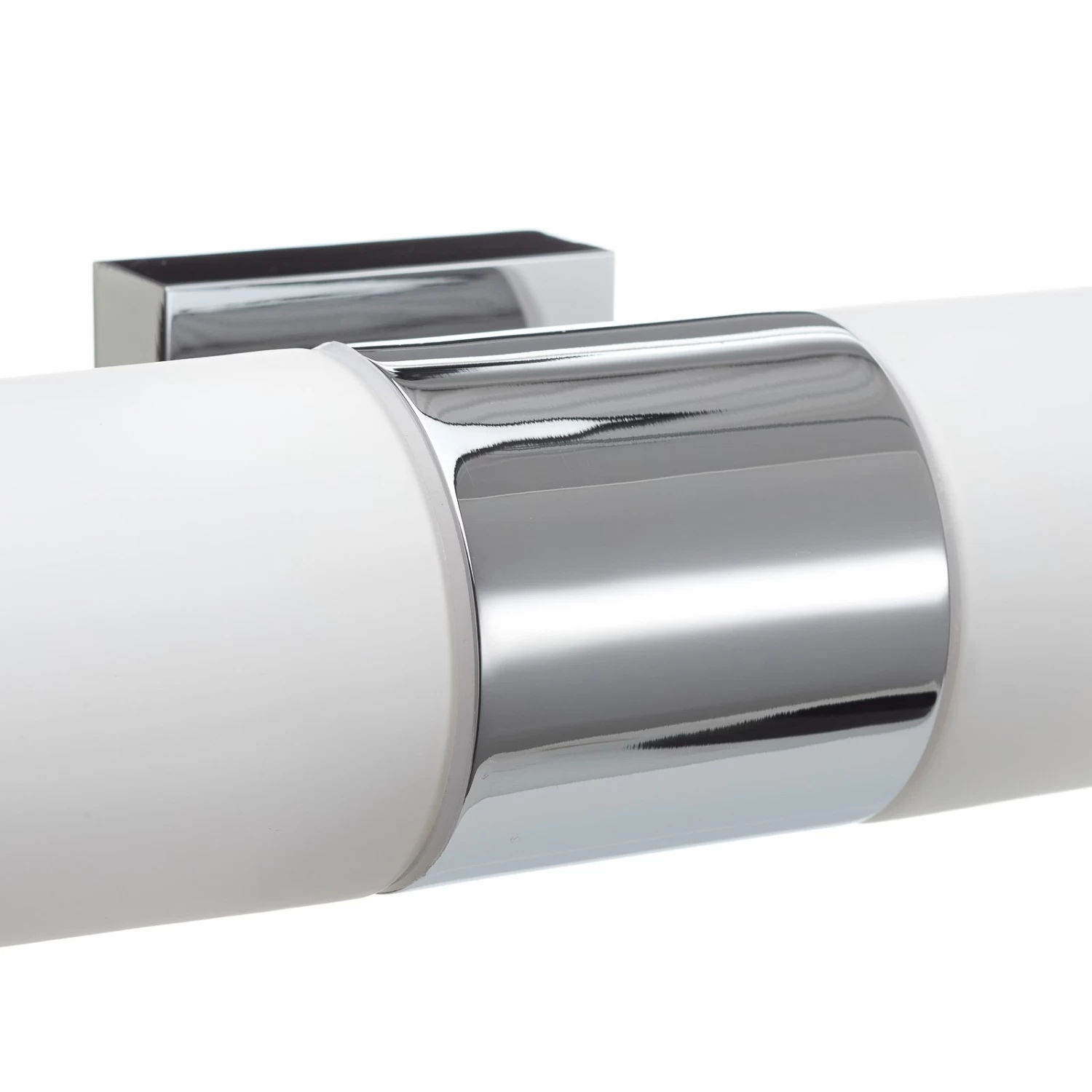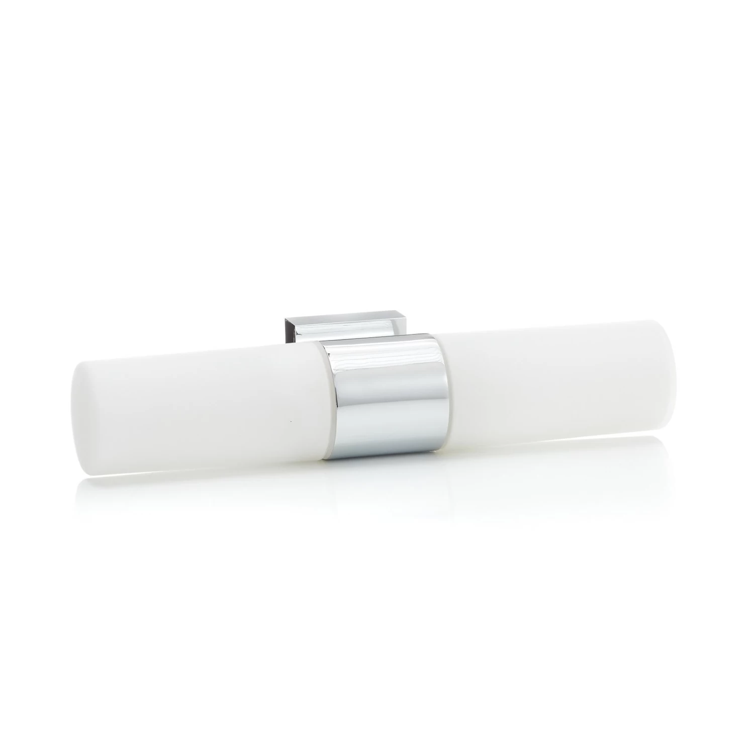 La fonctionnalité et l’esthétique sont en symbiose dans ce luminaire moderne. Sa structure en métal chromé et son diffuseur en verre satiné permet de l’utiliser comme applique pour miroir.