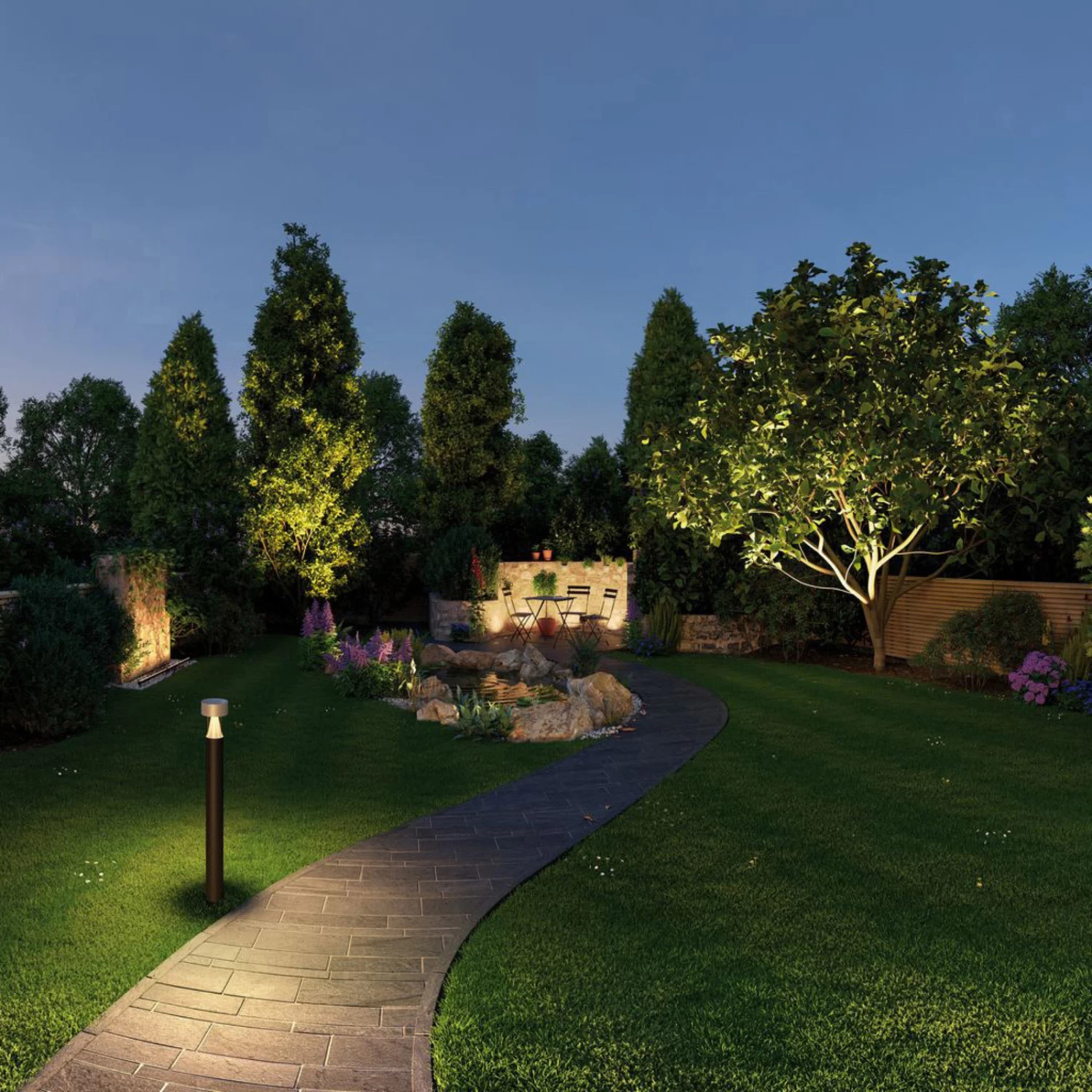 Le contrôleur est équipé d’une entrée et d’une sortie et est connecté entre le transformateur, le câble de rallonge (si nécessaire) et la lampe. Un piquet de sol est inclus pour l’ancrage dans le sol. La télécommande communique par radio avec un ou plusieurs contrôleurs et peut les commander individuellement ou ensemble, de sorte que les lumières en aval du contrôleur respectif peuvent être commutées ou tamisées.