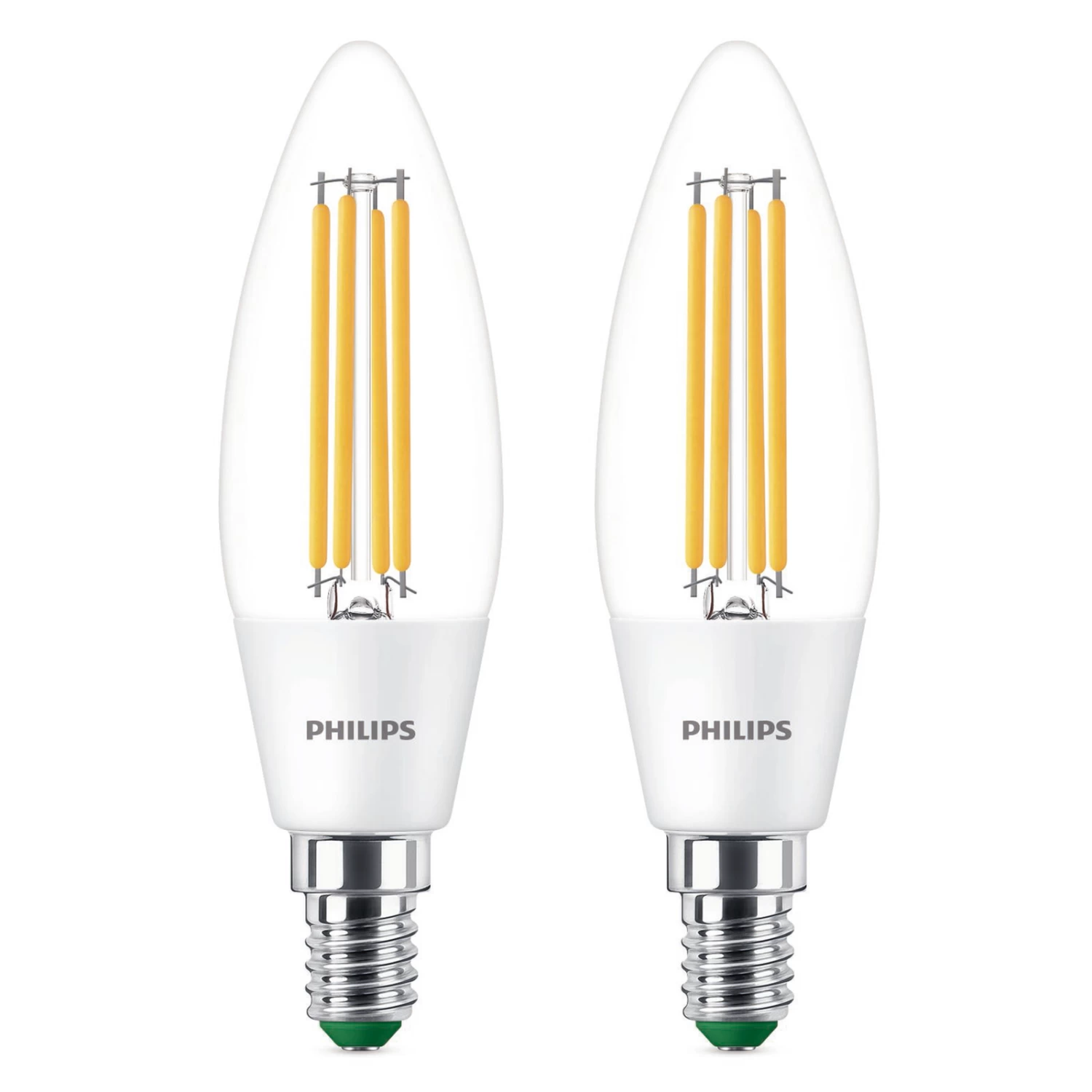 lot de 2 : ampoule LED E14 à filaments visibles, 2,3 watts, 485 lumens, 3.000 kelvinsCette ampoule LED pour bougie Philips convient aux douilles E14 et est particulièrement efficace. Avec 2,3 watts, elle atteint une efficacité lumineuse de 485 lumens. Grâce au verre transparent, la lumière blanc chaud est diffusée sans obstacle. Avec ses filaments visibles, elle est prédestinée à une utilisation dans des luminaires de conception ouverte et est disponible ici en multipack.Caractéristiques techniques:- excellente efficacité lumineuse, extrêmement économique (label A, Ultra Efficient) : jusqu’à 60% de consommation d’énergie en moins par rapport aux lampes LED traditionnelles- EyeComfort : une bonne qualité de lumière ménage les yeux et soutient la capacité de concentration – durée de vie nominale : 50.000 h- nombre de cycles de commutation : 50.000- non dimmable