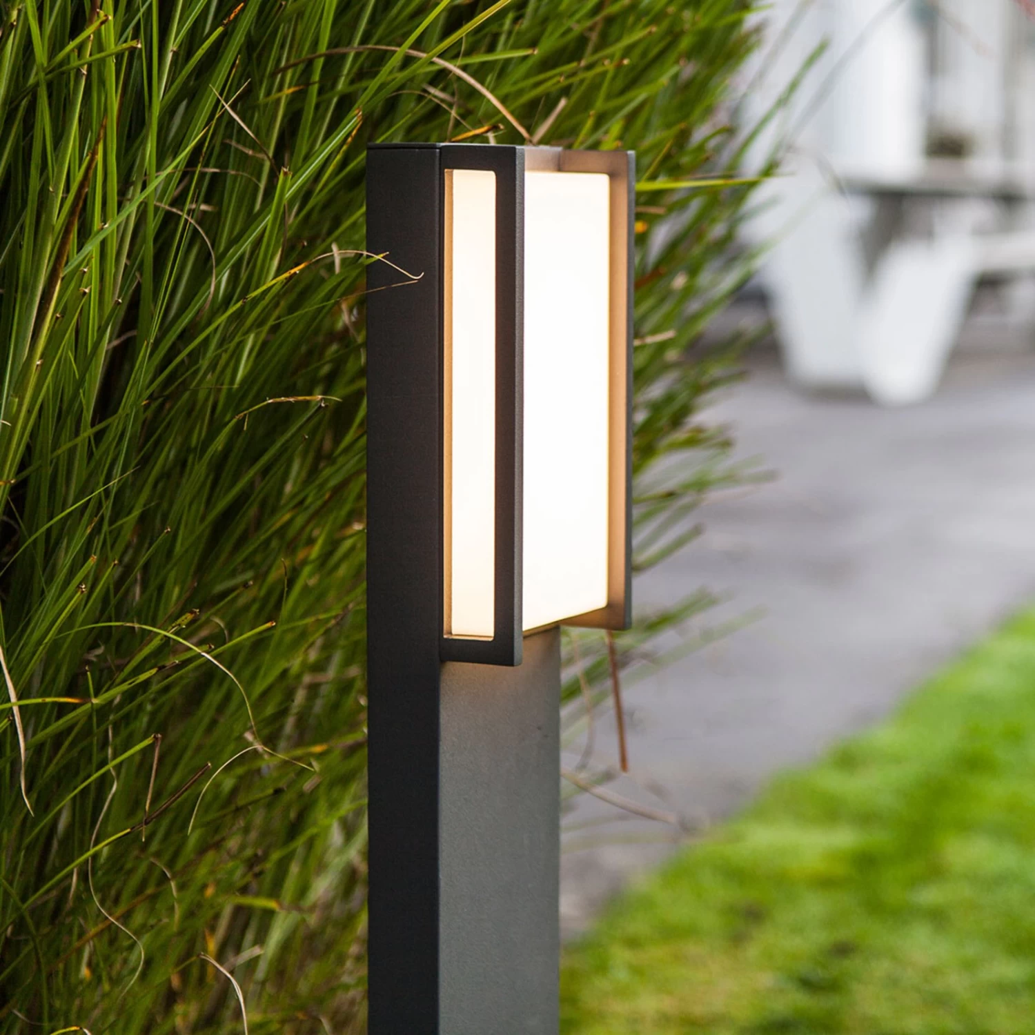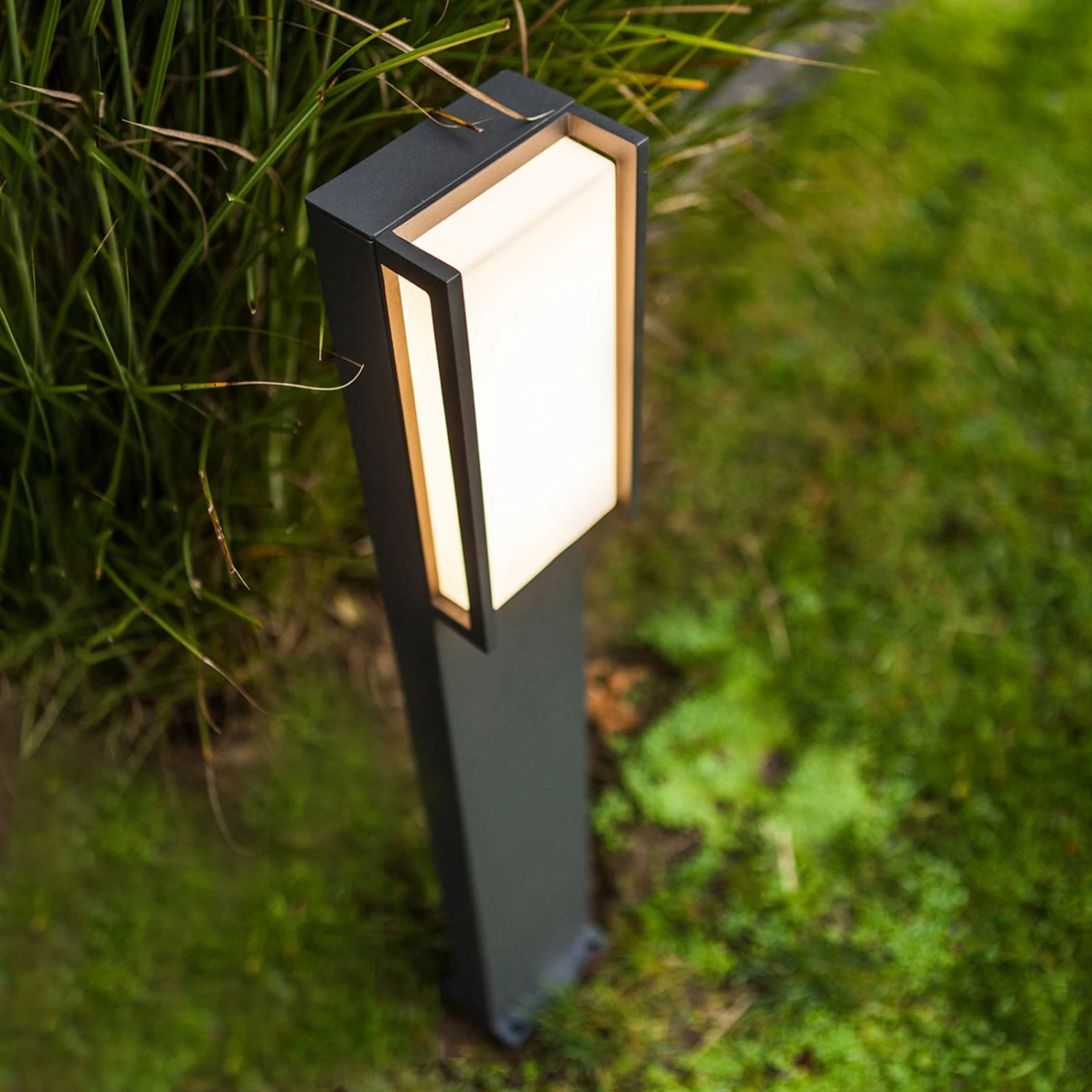 Une conception moderne aux formes rectilignes caractérise la borne lumineuse LED Qubo qui peut être installée sur le terrain pour éclairer les allées, les terrasses ou encore les marches d’escaliers. Le diffuseur carré en matériau synthétique blanc est entouré par les deux étriers métalliques qui le protègent, ce qui donne un look rustique à la lampe. La borne lumineuse est équipée de LED blanc chaud et est protégée contre les intempéries avec la protection IP54.