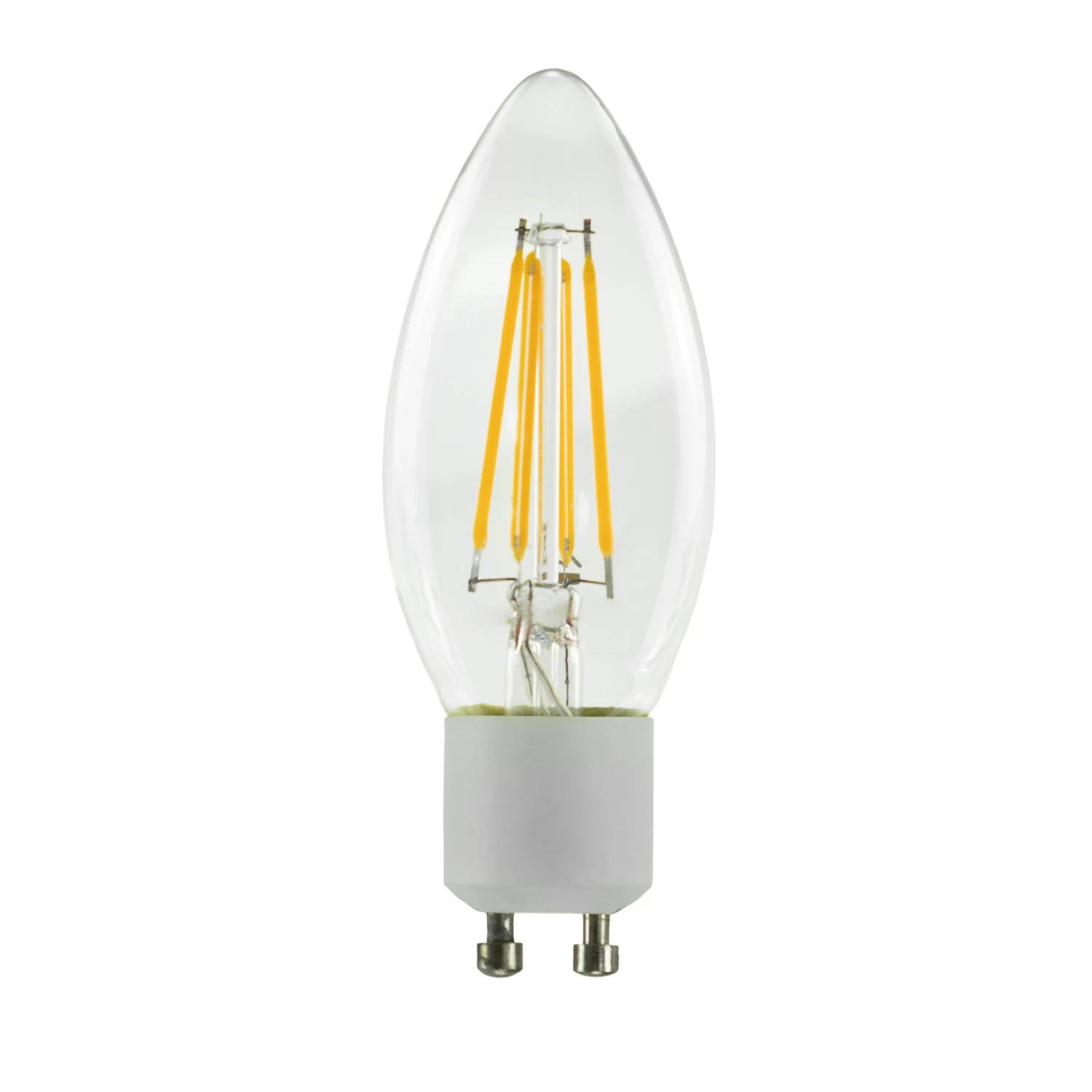 Ampoule LED en forme de bougie avec culot GU10 3,2W filament 2.700K dimmableGrâce au culot GU10, cette ampoule LED en forme de bougie traditionnelle avec la technique du filament peut également être utilisée dans des luminaires où seuls des réflecteurs pouvaient être utilisés jusqu’à présent. La lampe bougie émet une lumière blanche chaude qui se caractérise par un rendu des couleurs particulièrement bon, de sorte que même les nuances les plus fines de la lumière sont fidèlement reproduites.- couleur de lumière chaude 2.700 K- rendu des couleurs particulièrement bon (Ra >90)- gradable avec de nombreux variateurs courants comme GIRA, ELTAKO, Jung et autres.