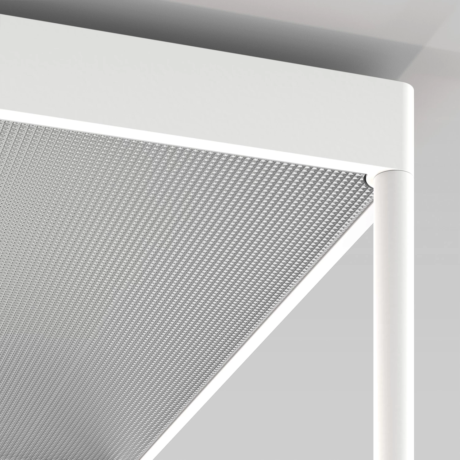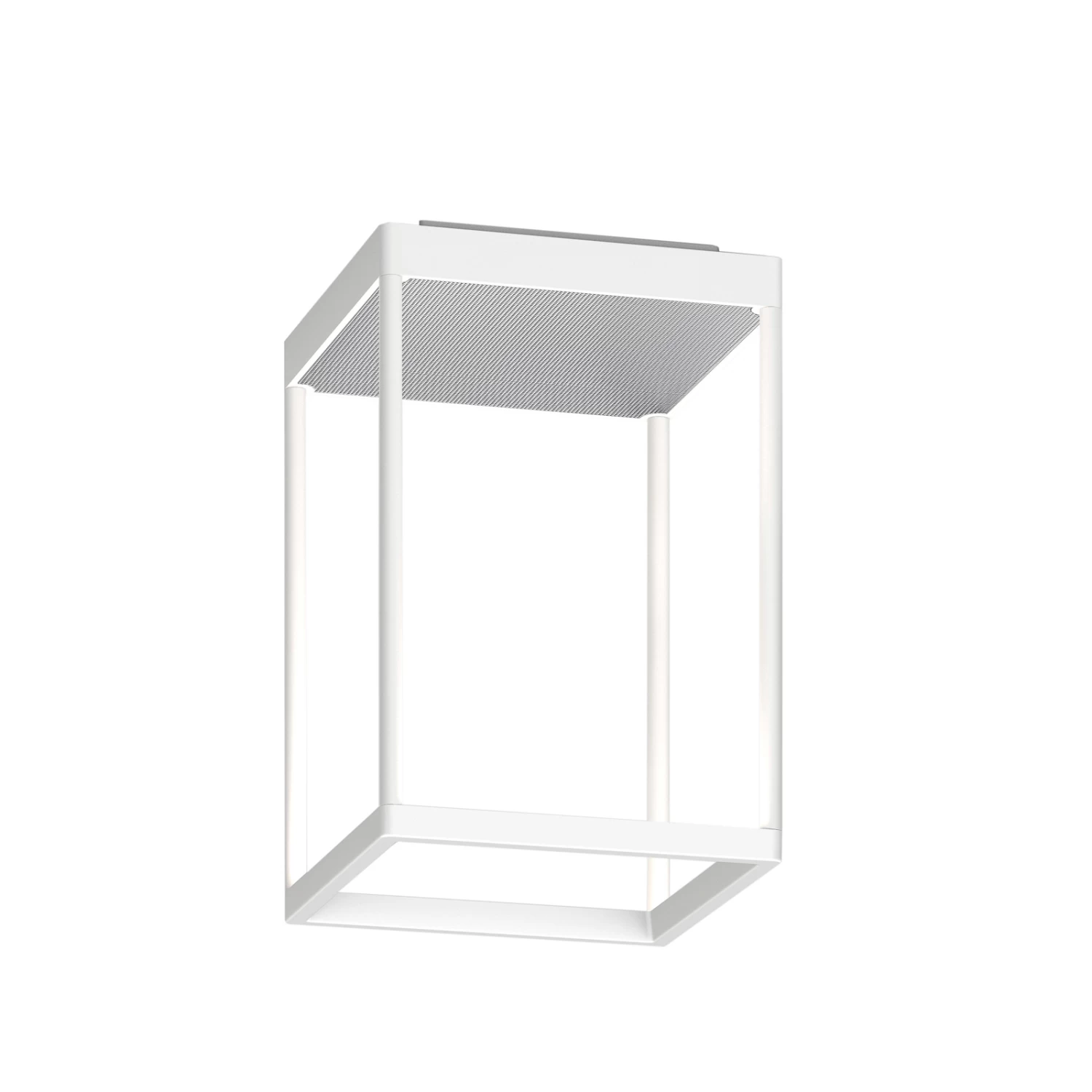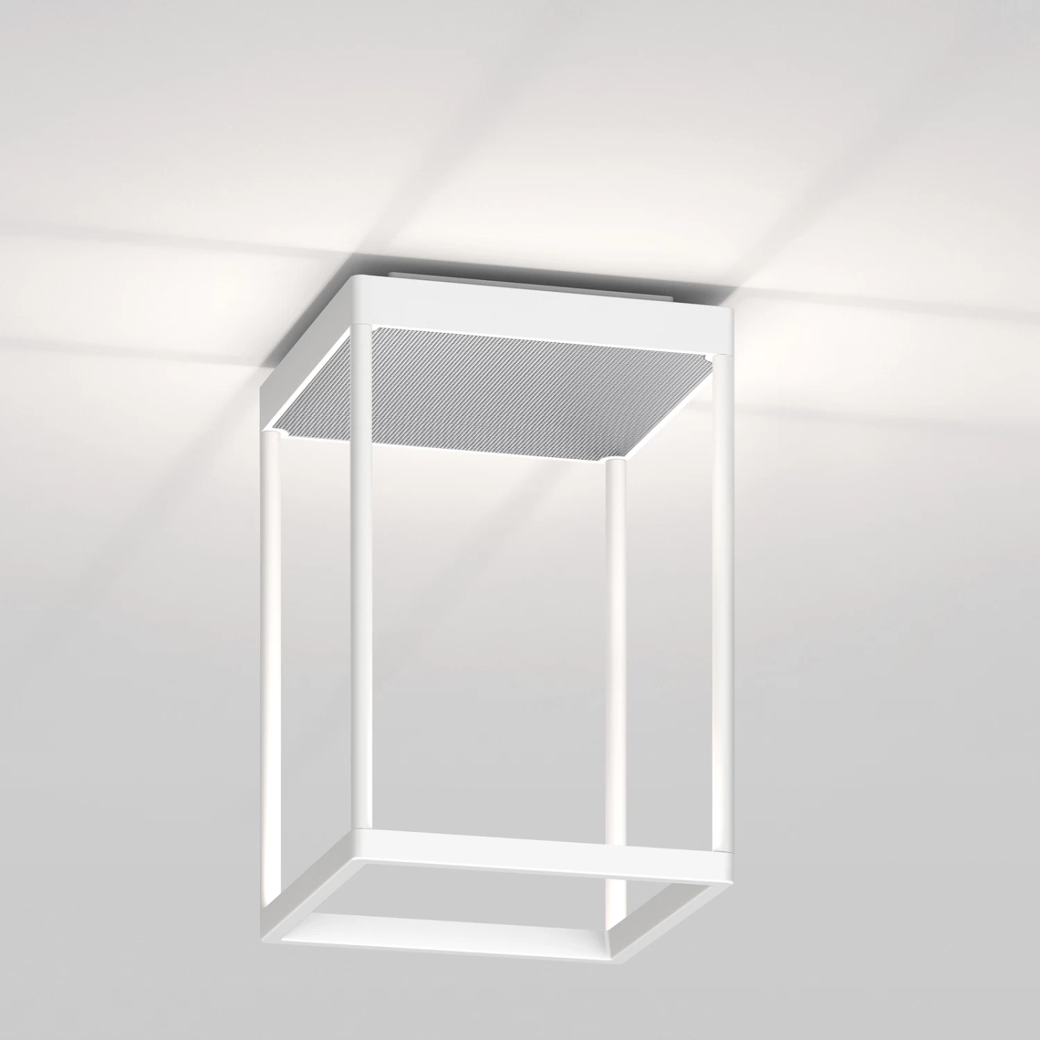Plafonnier LED Reflex² S, parallélépipède ouvert, 2.700 K, gradation externe par triac, base 20 cm x 20 cmLe plafonnier LED Reflex² S a été conçu par Jean-Marc da Costa, l’un des fondateurs et directeurs de serien.lighting. Son cadre ouvert avec de fines entretoises est fabriqué en aluminium. Les LED sont intégrées sur les faces supérieures des entretoises inférieures derrière un verre plat et rayonnent en direction du plafond, où la lumière tombe sur un réflecteur prismatique en plexiglas.Des LED de haute qualité sont intégrées d’origine et offrent une lumière blanc chaud avec un bon rendu des couleurs. L’intensité lumineuse peut en outre être réglée de manière externe par un triac.