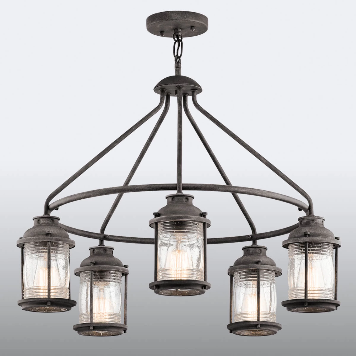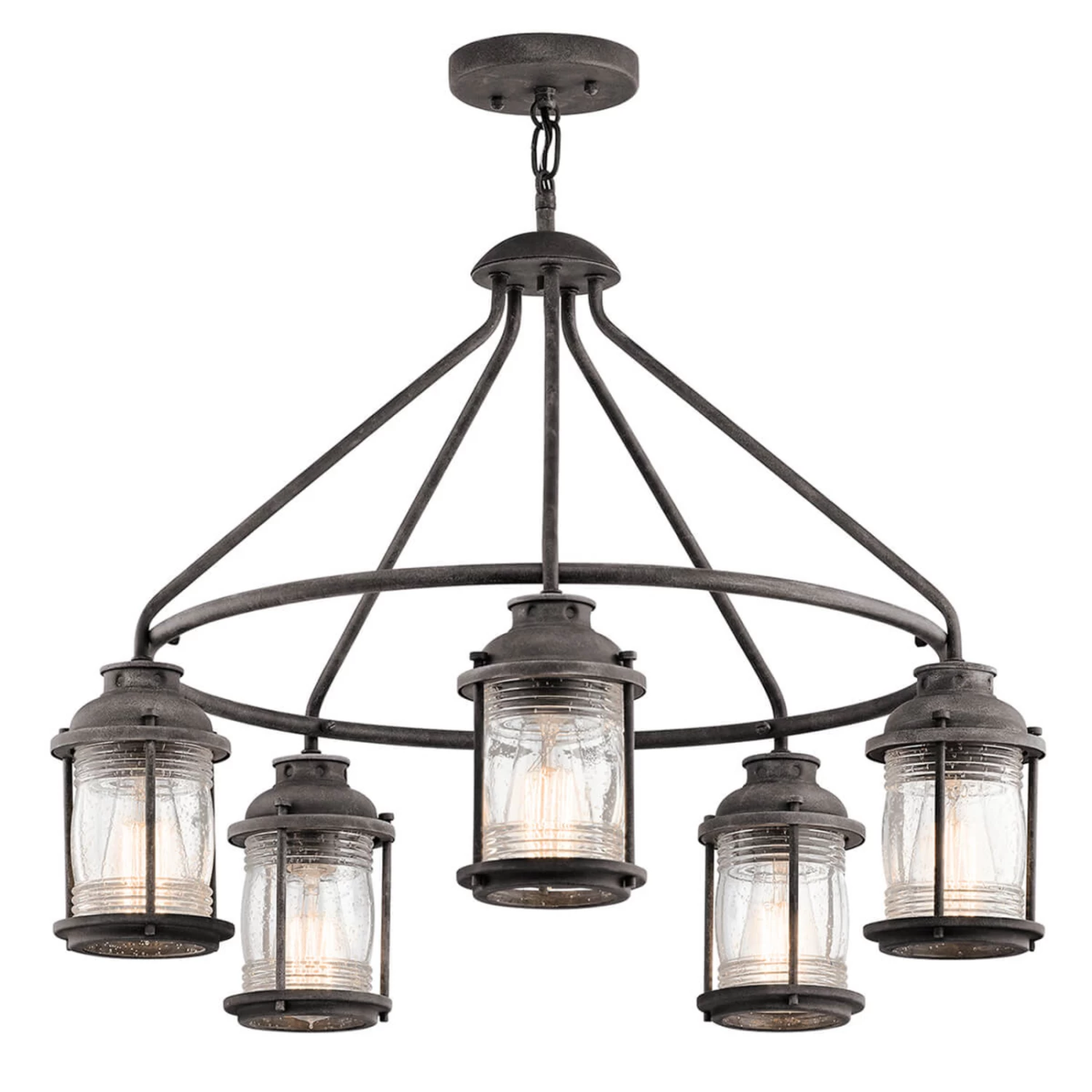 La suspension Ashland Bay au design en zinc patiné porte cinq lampes en forme de lanterne et affiche un léger style colonial. L’utilisation d’ampoule aspect filament de carbone par exemple vient renforcer l’effet décoratif de la lampe.