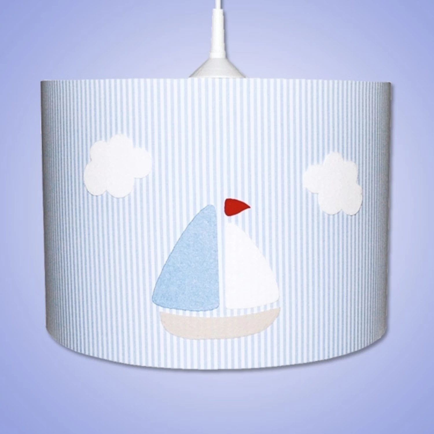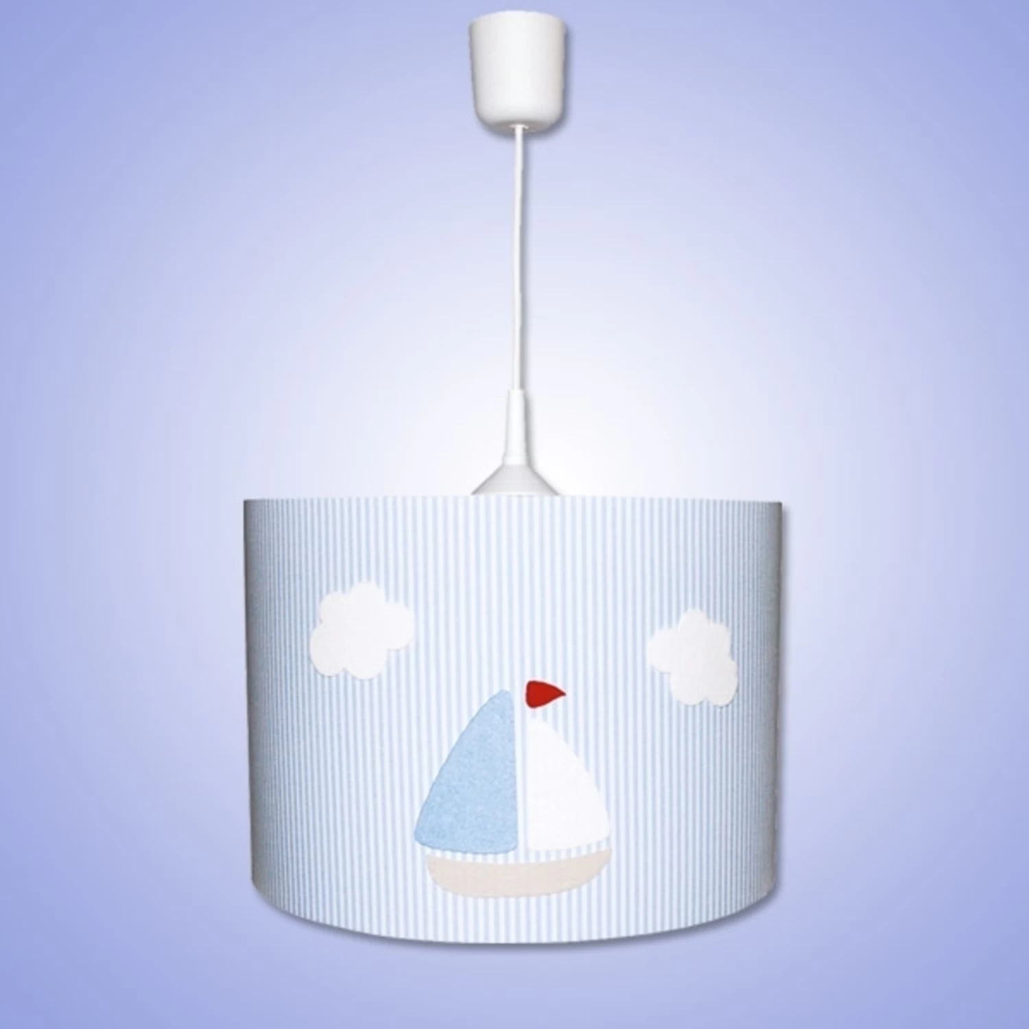 L’abat-jour à rayures bleu clair en coton roulé à la main est décoré d’un joli motif de bateau imprimé qui fait de cette suspension l’éclairage idéal pour votre chambre d’enfant.