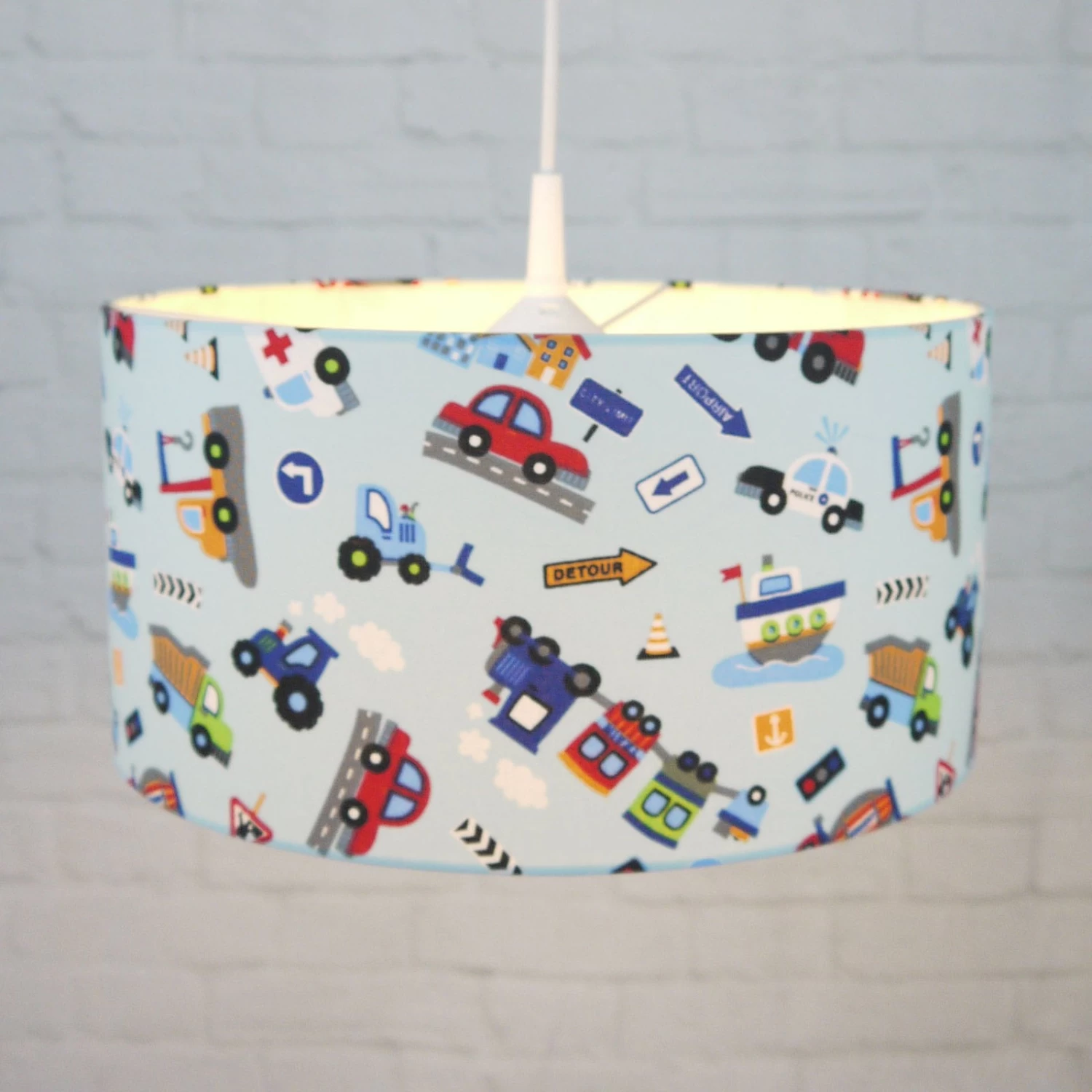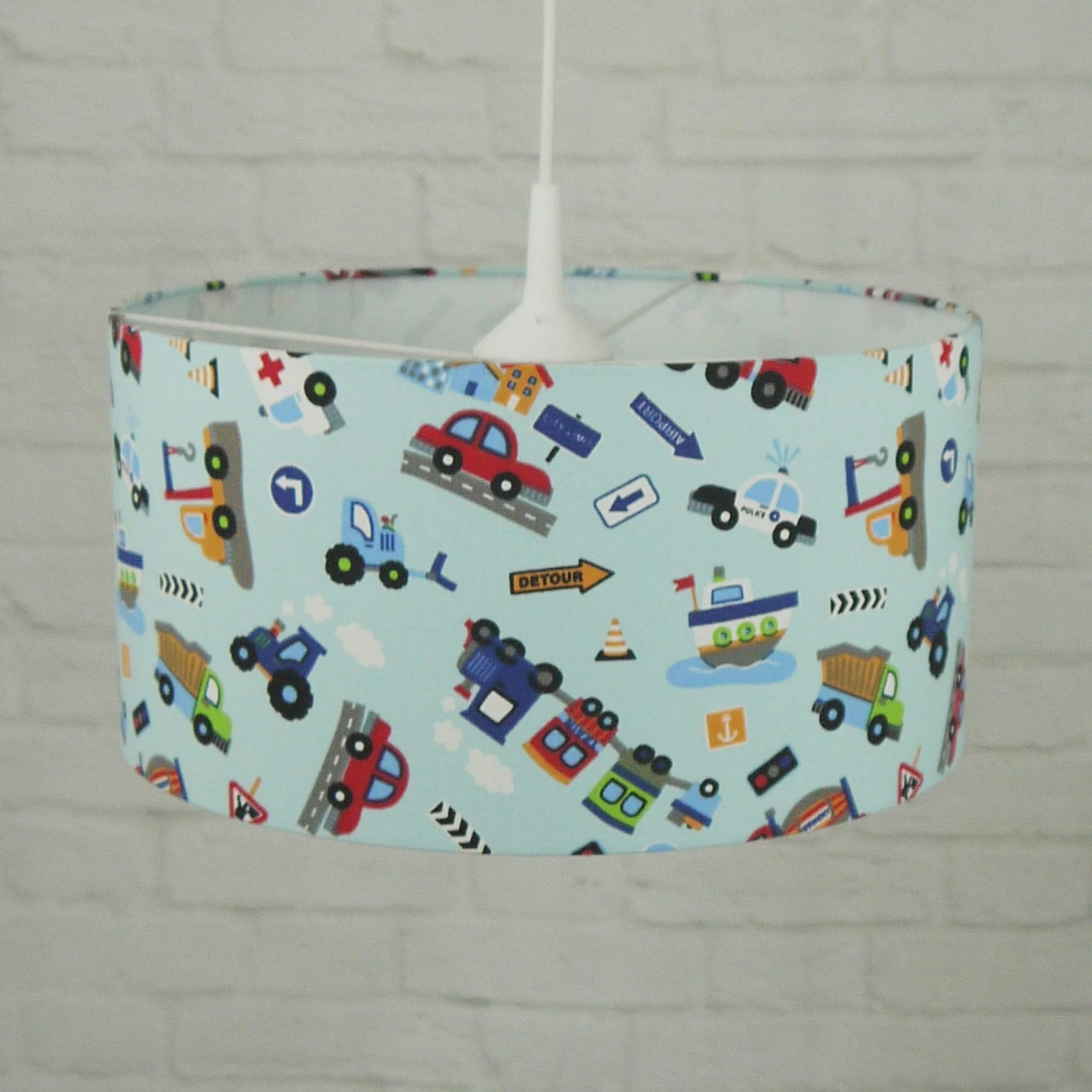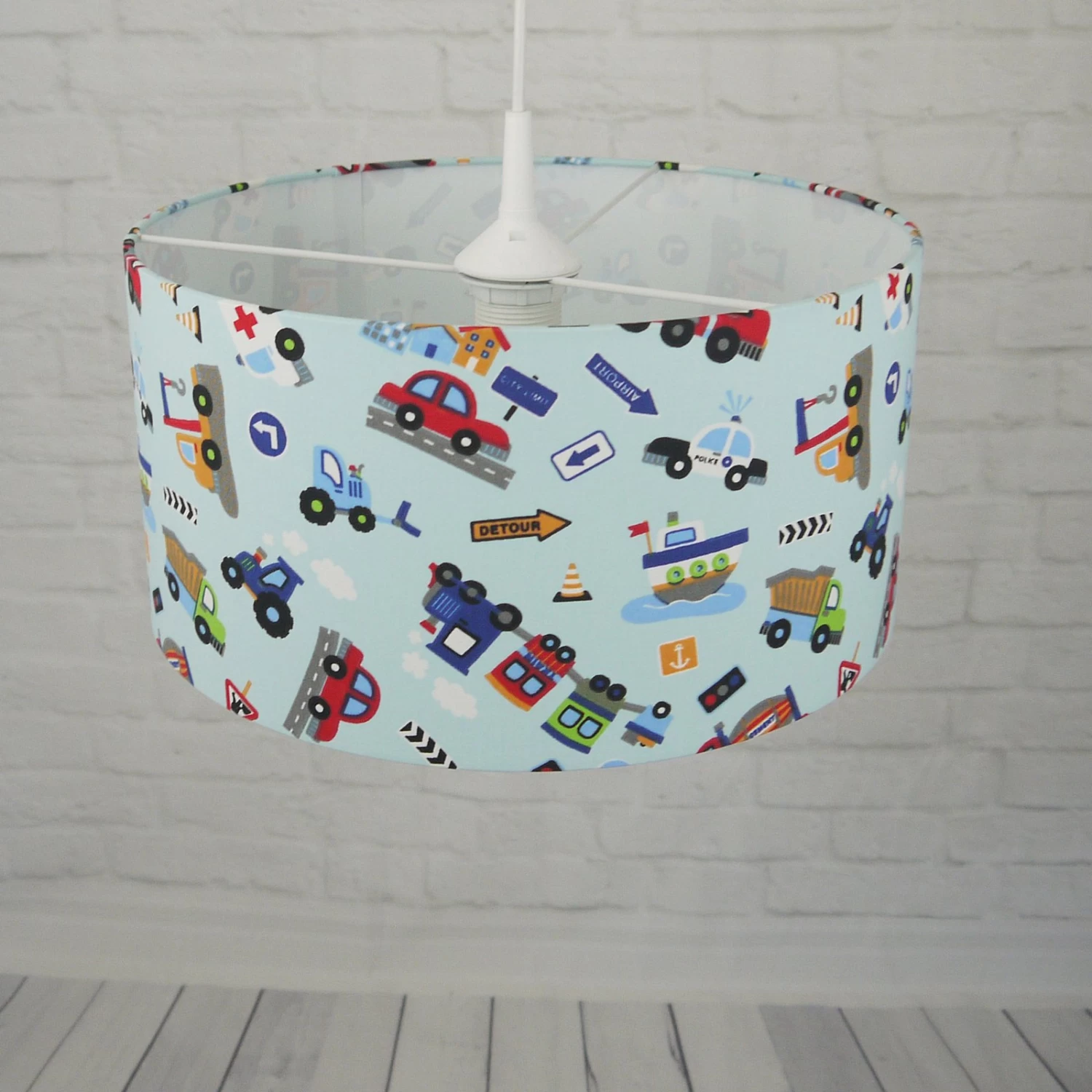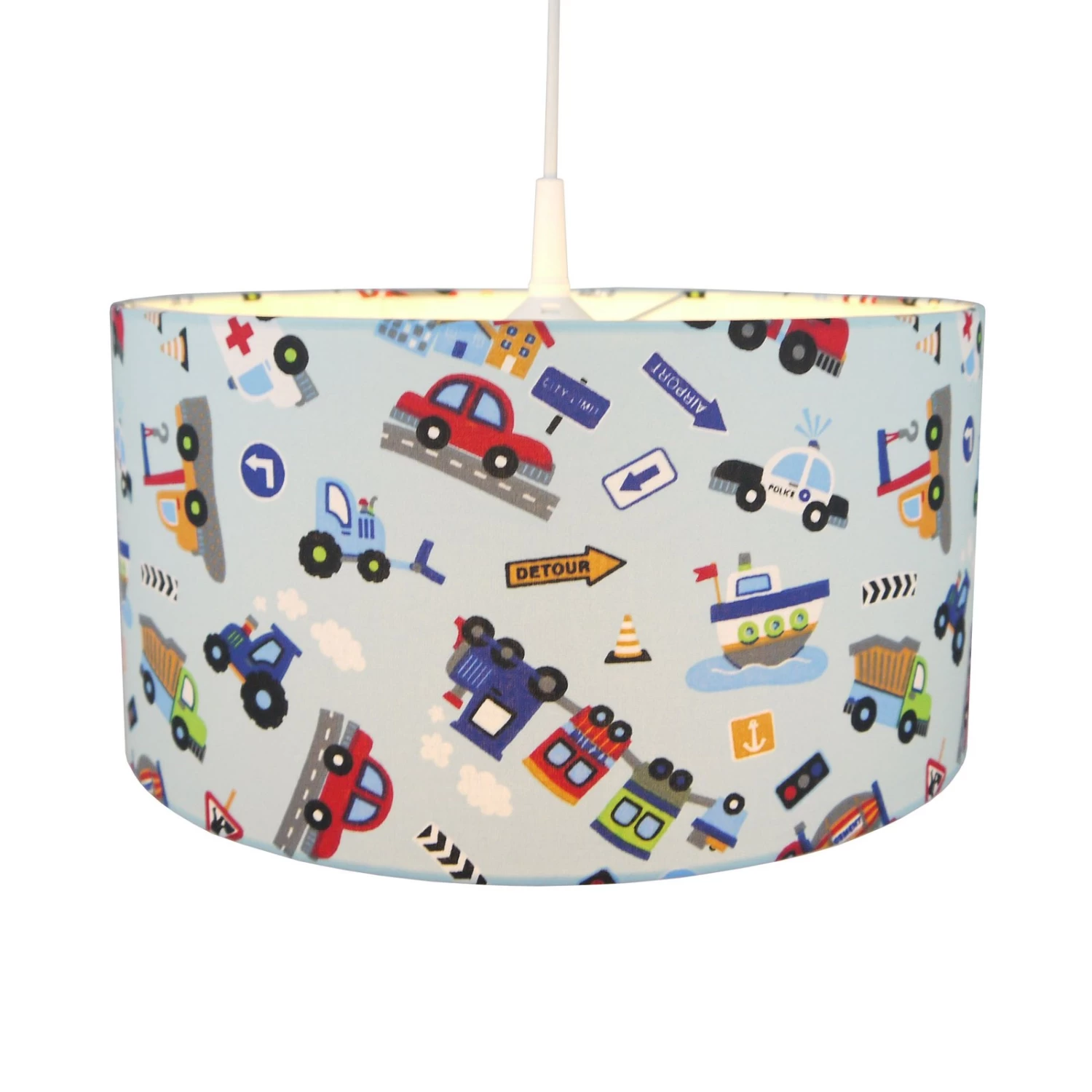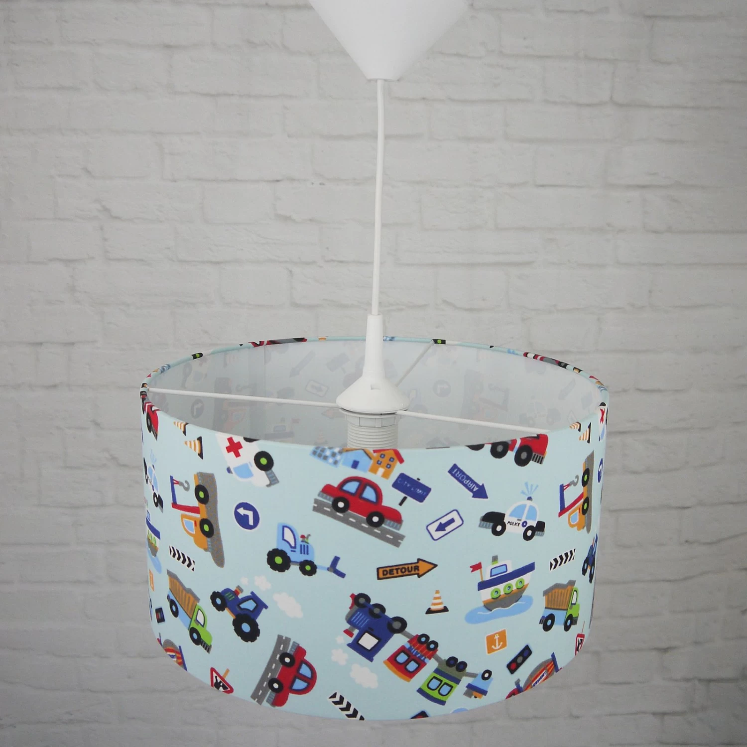 L’abat-jour textile au design saisissant du luminaire suspendu Véhicules attire immédiatement l’attention de tous les observateurs, grands et petits, car des véhicules de toutes sortes y sont présentés. Outre son design accrocheur, le luminaire est par ailleurs assez sobre. Il se compose d’un abat-jour cylindrique dissimulant une douille E27 et d’une suspension blanche à l’auvent. La lampe suspendue est idéale pour éclairer la chambre des enfants et découvrir les différents moyens de transport.