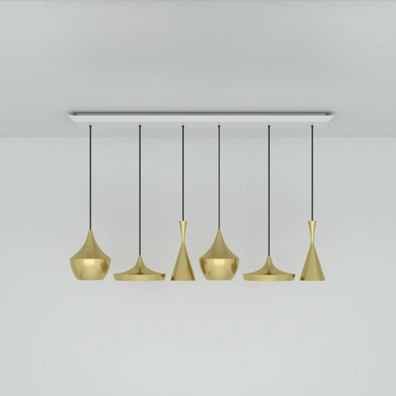 Pour la suspension à six flammes Beat Range Linear, deux abat-jour étroits, deux larges et deux larges de la série Beat ont été positionnés en ligne. Cette disposition est très élégante et assure un éclairage varié. La forme des abat-jour s’inspire des récipients à eau indiens et est fabriquée par des artisans dans le nord de l’Inde au cours d’un processus complexe qui dure quatre jours. Le laiton est étiré à la main, soudé, frappé, puis poncé sur un tour. L’intérieur présente encore les traces du marteau. Cette structure, combinée à la chaleur du laiton, provoque une merveilleuse réflexion de la lumière émise et crée un éclairage brillant.