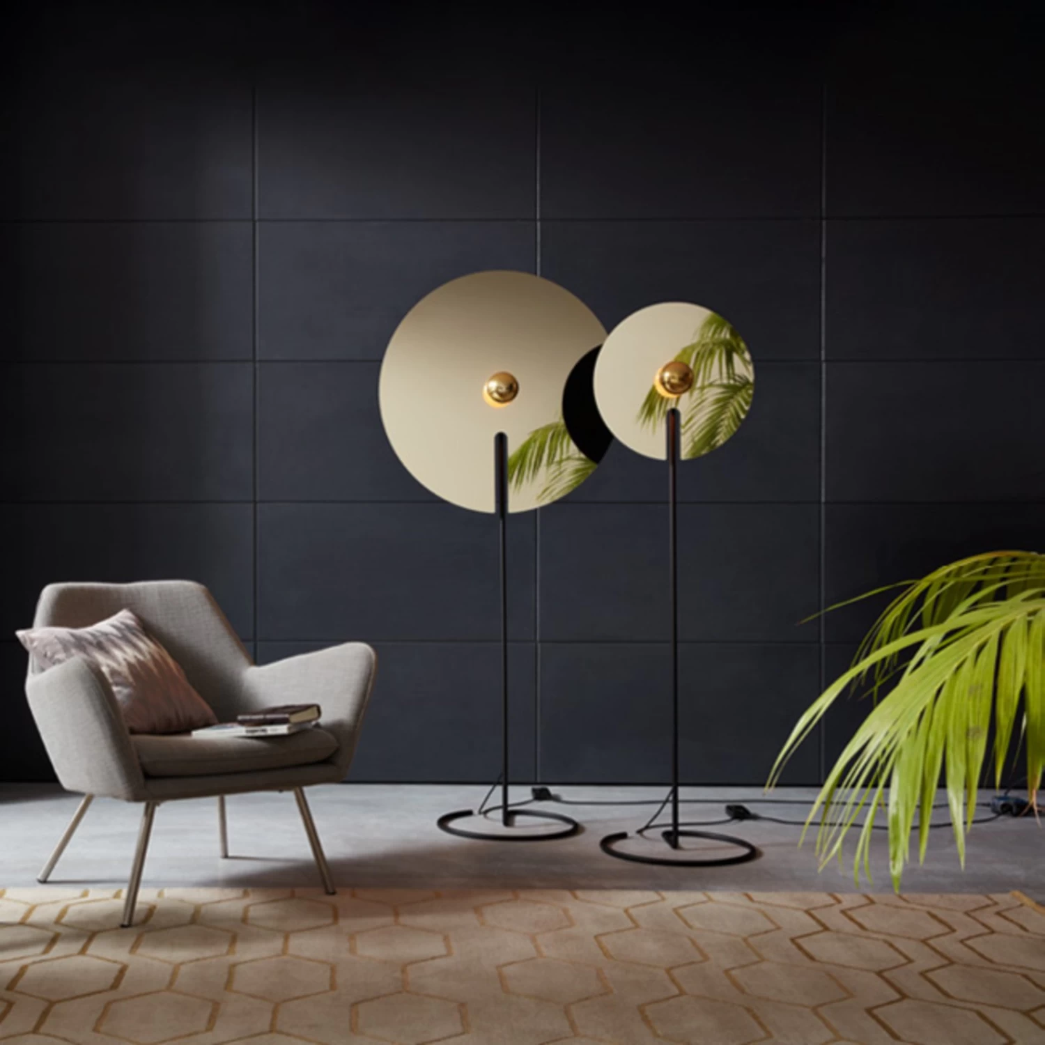 Si vous cherchez une source de lumière spéciale pour votre salon ou votre chambre à coucher, le lampadaire Mirro est l’option idéale. Une plaque de métal s’élève dans la pièce depuis son cadre métallique noir de conception moderne, dans lequel est encastrée, au milieu, la douille de la lampe à insérer. Un coup d’œil sur le disque en aluminium, qui est noir d’une part et brillant d’autre part, suffit à faire comprendre à l’observateur que le nom du luminaire a été choisi en référence au mot anglais « mirror » (miroir), car tous les objets à portée de main sont réfléchis dans la surface brillante.